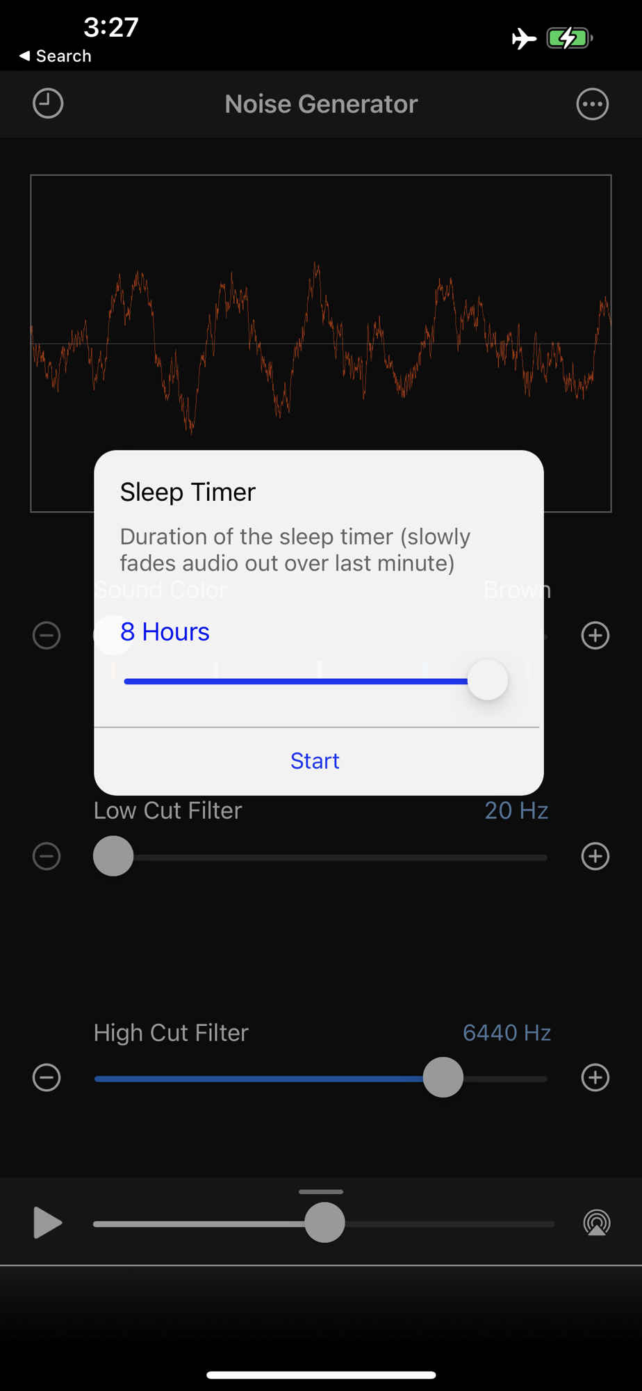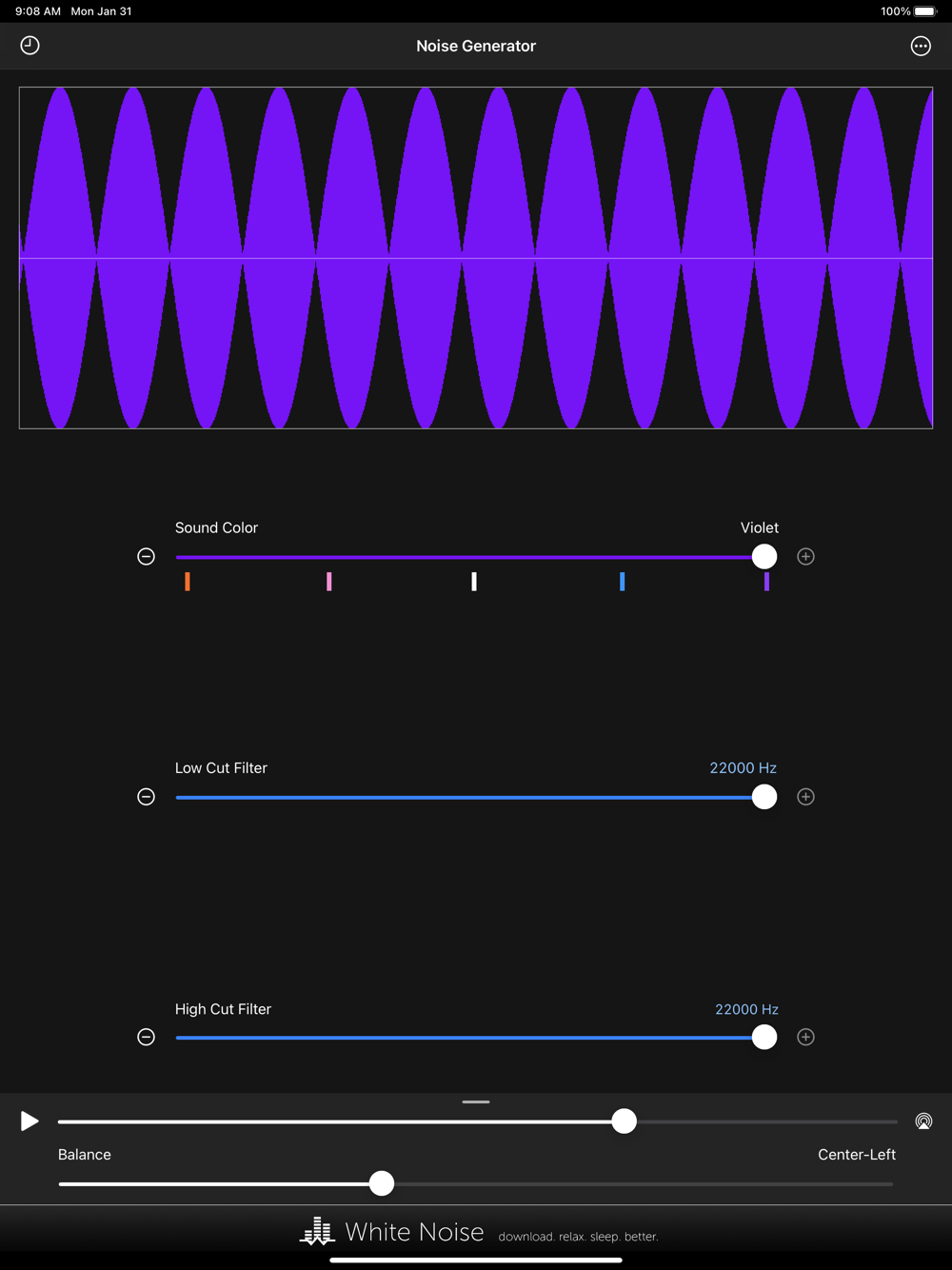 Drag the Sound Color slider to select brown, pink, white, blue, violet, or somewhere in-between. Next, drag the low and high cut filters to further customize to your liking. Adjust device volume using the on-screen volume slider to a comfortable level. You can also specify to play audio to any AirPlay supported device. Toggle audio playback using the Play/Pause button.