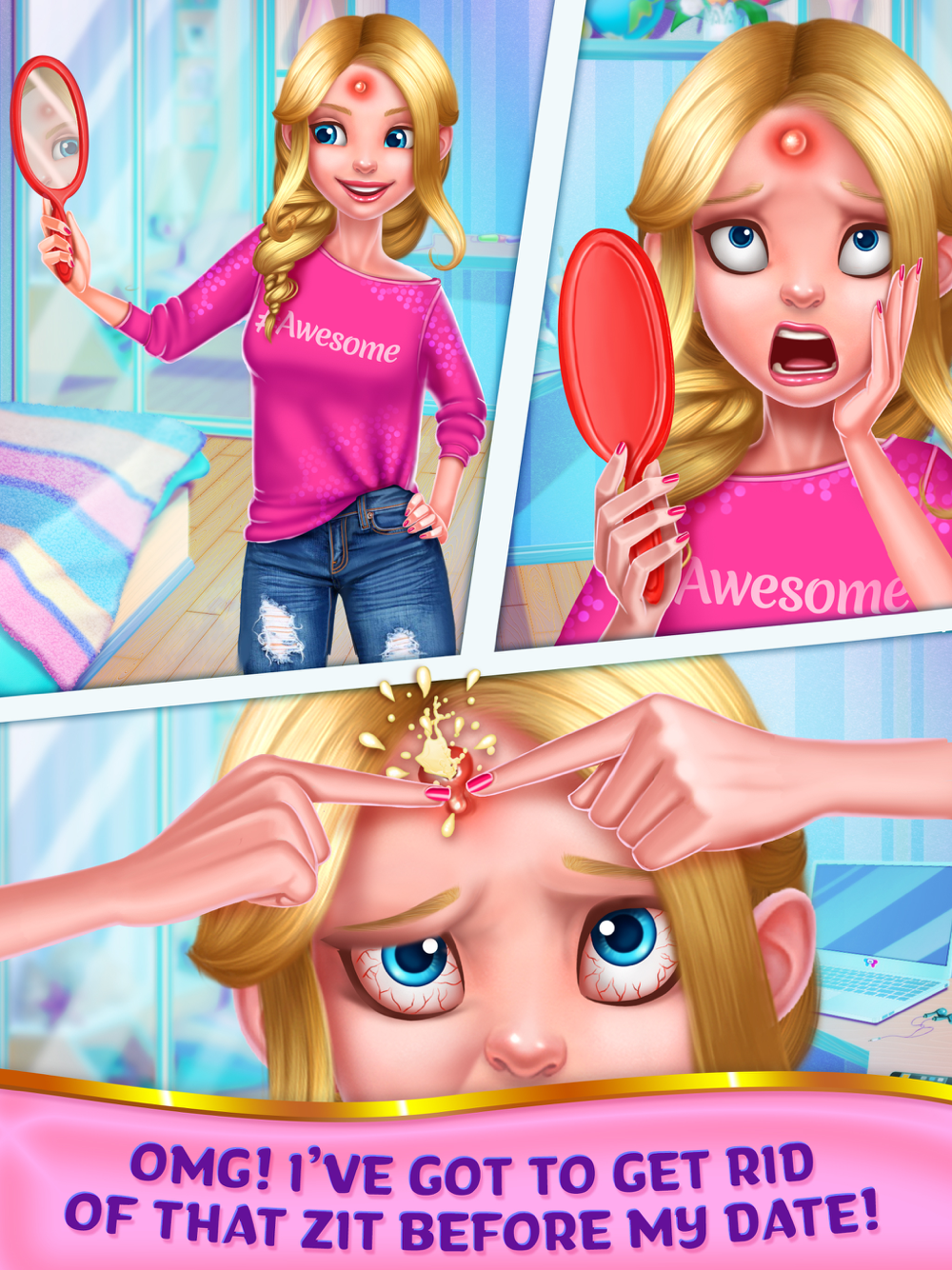 Today’s the day you’ve been waiting for – your date with adorable Ethan! Better get out of bed and start making yourself beautiful! Wait – OMG… Is that a ZIT?! And not just any zit – a disgusting, HUGE zit! You have to get rid of it before Ethan comes to pick you up! You’ll try anything! But will you succeed?!