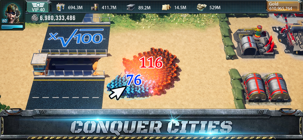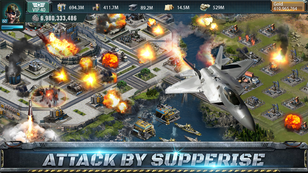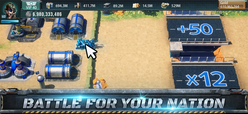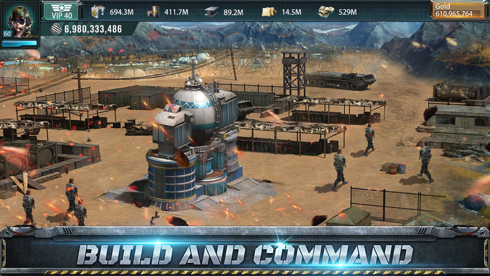 - Resources management (electricity, oil, iron, food, cash, and gold) to build your buildings, train your troops, craft war machines and upgrade them.