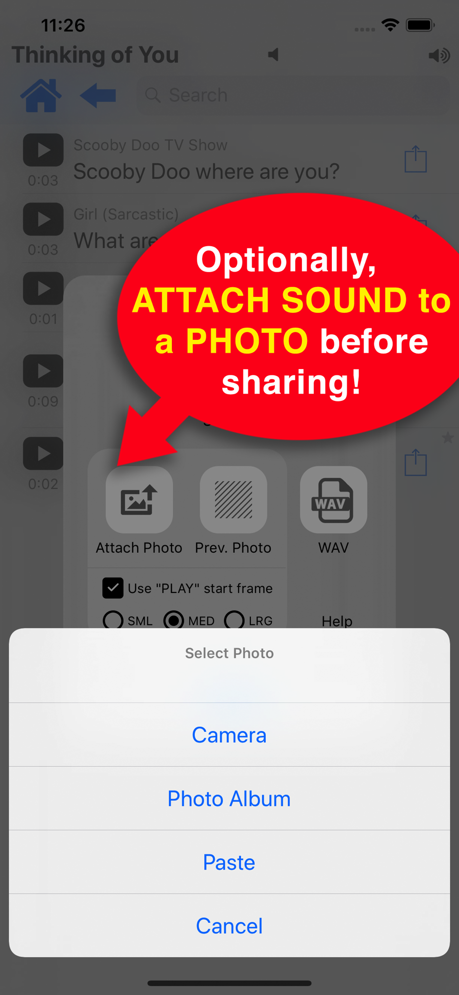 You can also attach any of the sounds to your own photos! For example, instead of just sharing a photo of your kids soccer team, attach a sound to it, such as “We are the champions!”