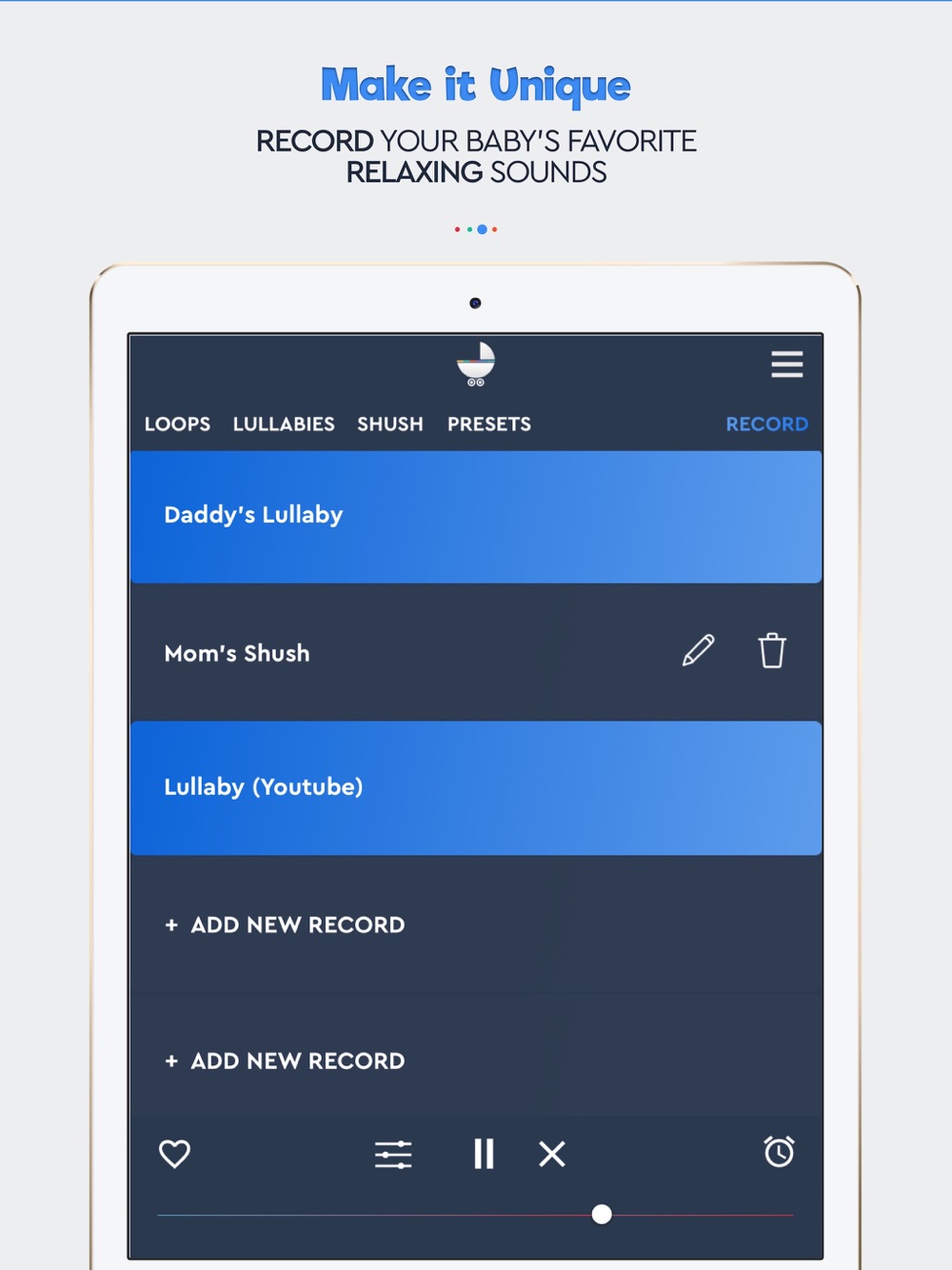 Loops: Rain, White Noise, Womb Sounds, Pink and Brown Noise, Zen, Ocean, Waterfall, Birds, Underwater, Chill-Out, Railway, Hair Dryer, Heartbeat, Night, Dryer, Vacuum, Lightning, Wind, Crowd, Classic Music, Car Ride, Fireplace, Flute, and many more...