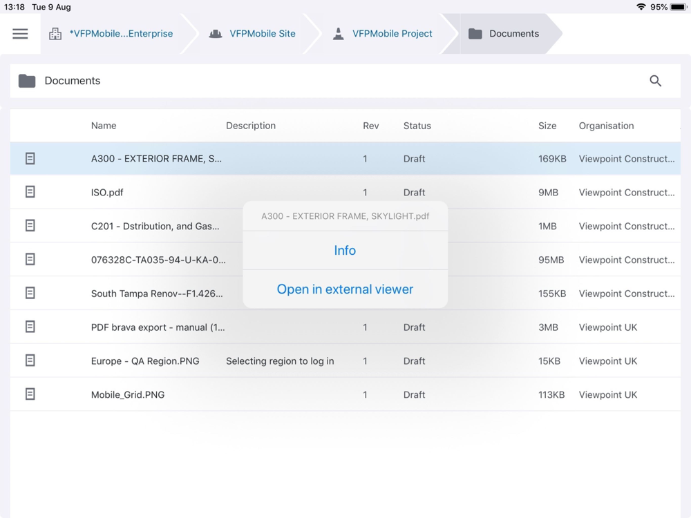 Viewpoint For Projects Mobile extends document collaboration in to the field with the ability to view VFP documents and drawings on the job site, even when there’s no internet connection. Future releases will build out additional features and functionality.