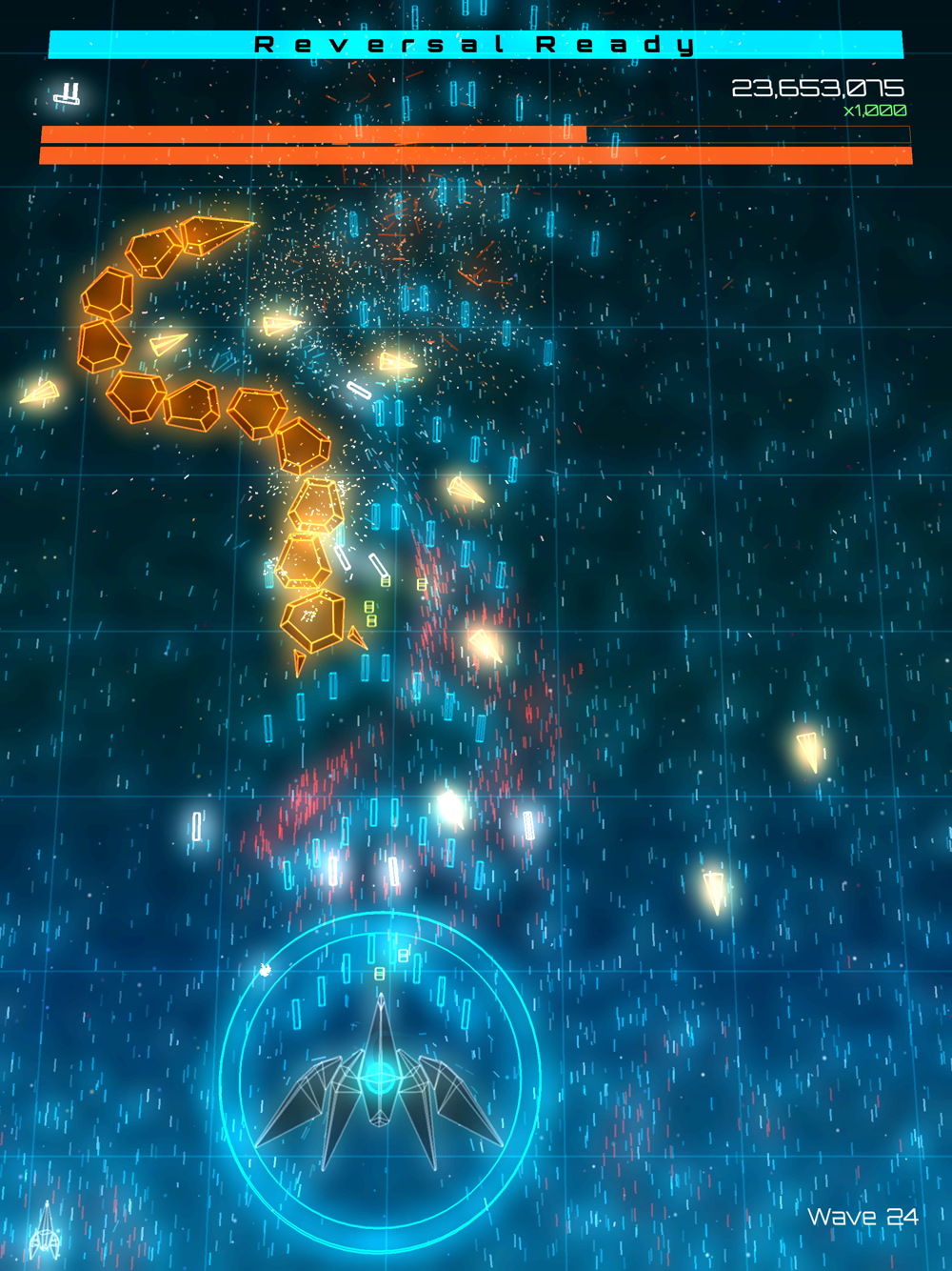 You have a special REVERSAL ability that charges every 20 seconds. Once charged you tap with a second finger onto the screen (or double tap) and all enemy bullets flip around into seeking missiles helping you escape impossible odds and get epic clears.