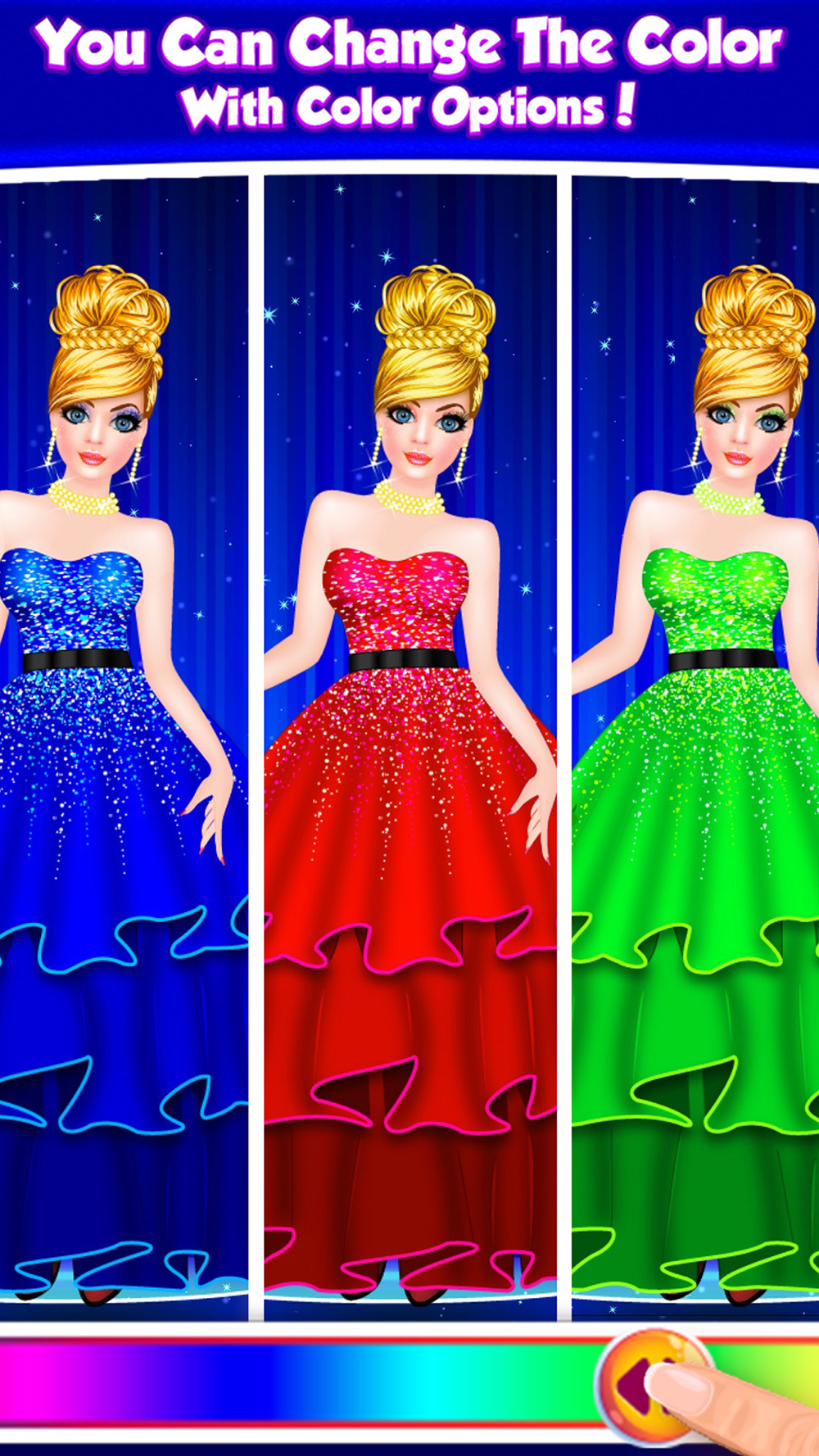 - Give her delightful look with beautiful hairstyle; you can change the hair color by sliding the color option
