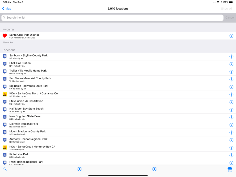 - Filter what type of location to display. For example, list only free dump stations from the filter.