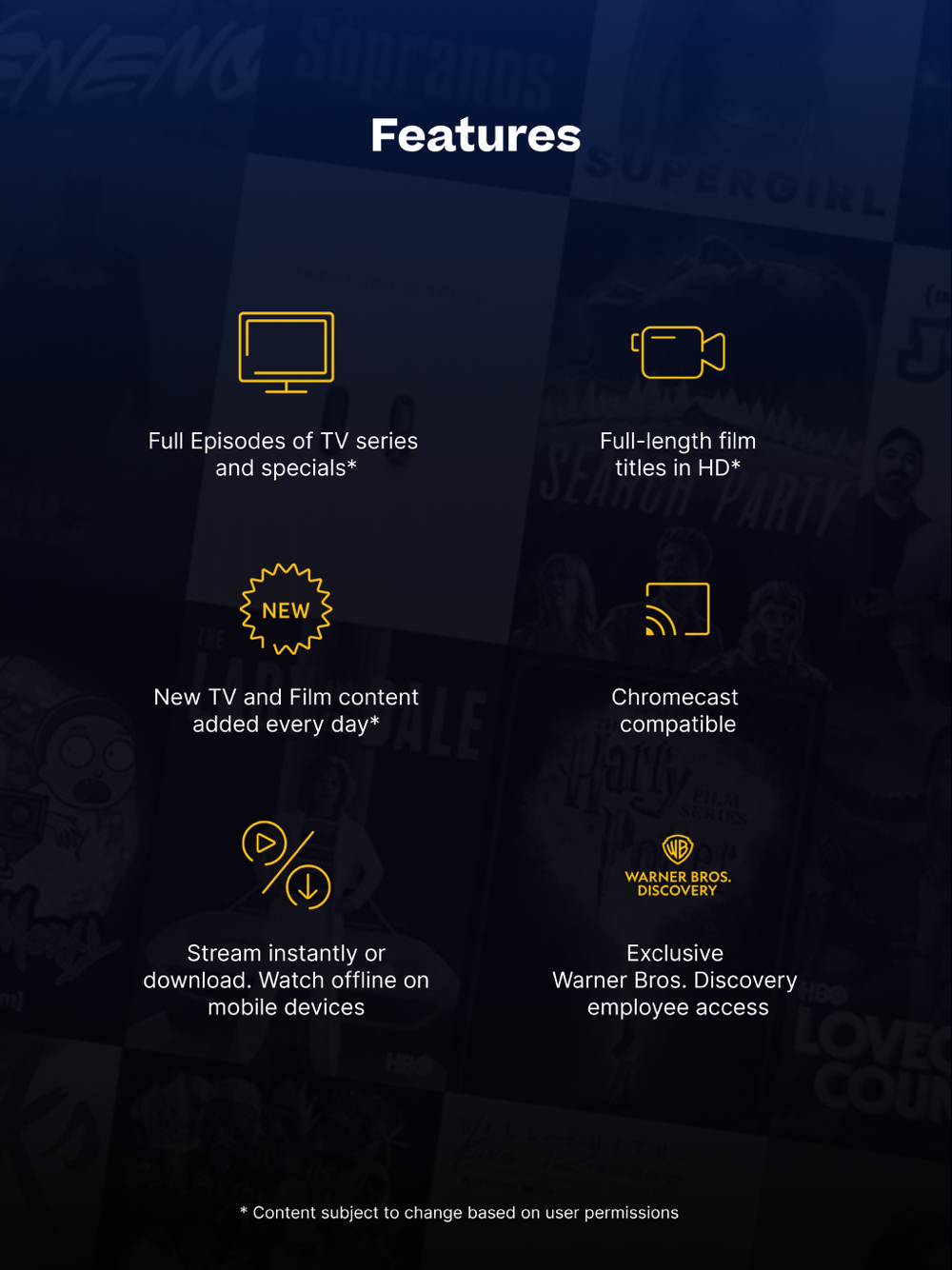 Warner Bros. Discovery Screeners app allows authorized Warner Bros. Discovery Partners, clients, and Employees the ability to preview and download or stream Warner Bros. Discovery TV and Film Content.