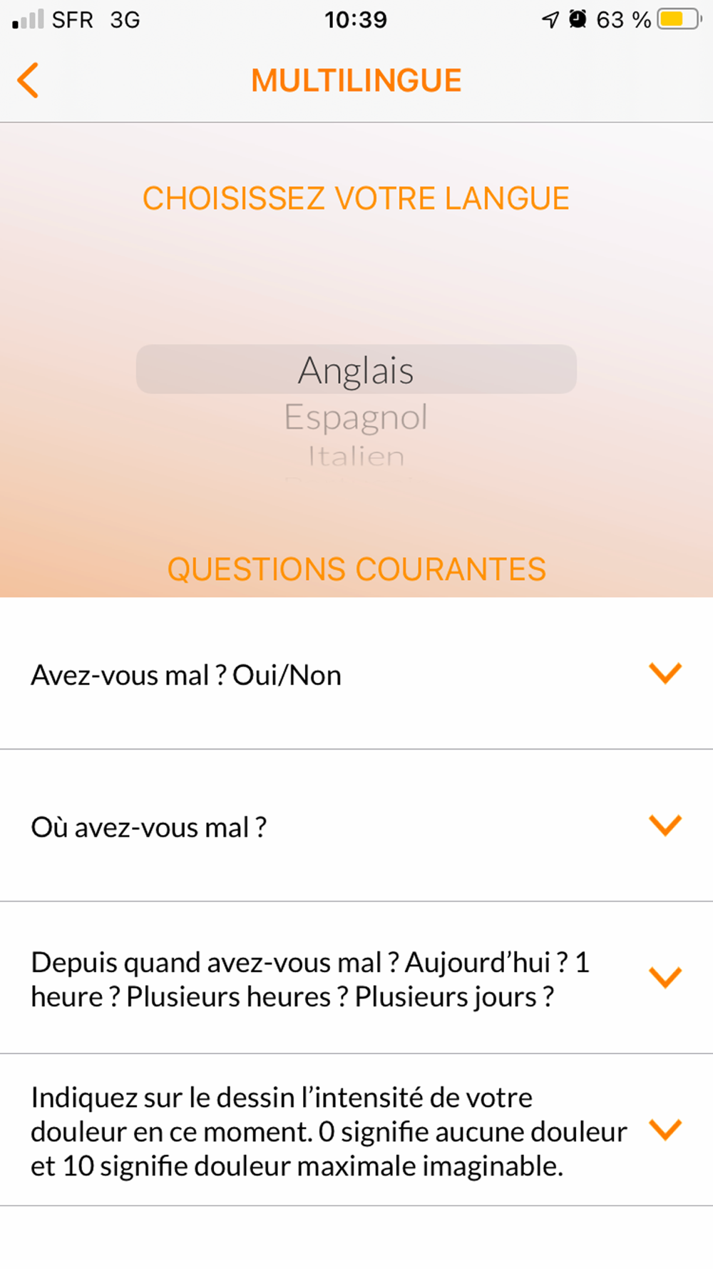 - Une aide à l'évaluation des patients douloureux, avec l'échelle numérique, l'échelle verbale simple, l'échelle Algoplus(R), mais également un outil de traduction permettant de communiquer avec les patients étrangers (anglais, italiens, espagnols, allemands, portugais, arabes...), et le score DN4 pour dépister les douleurs neuropathiques