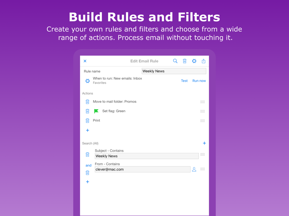The most sophisticated email rules engine on the app store! Huge range of choices for filters and actions.
