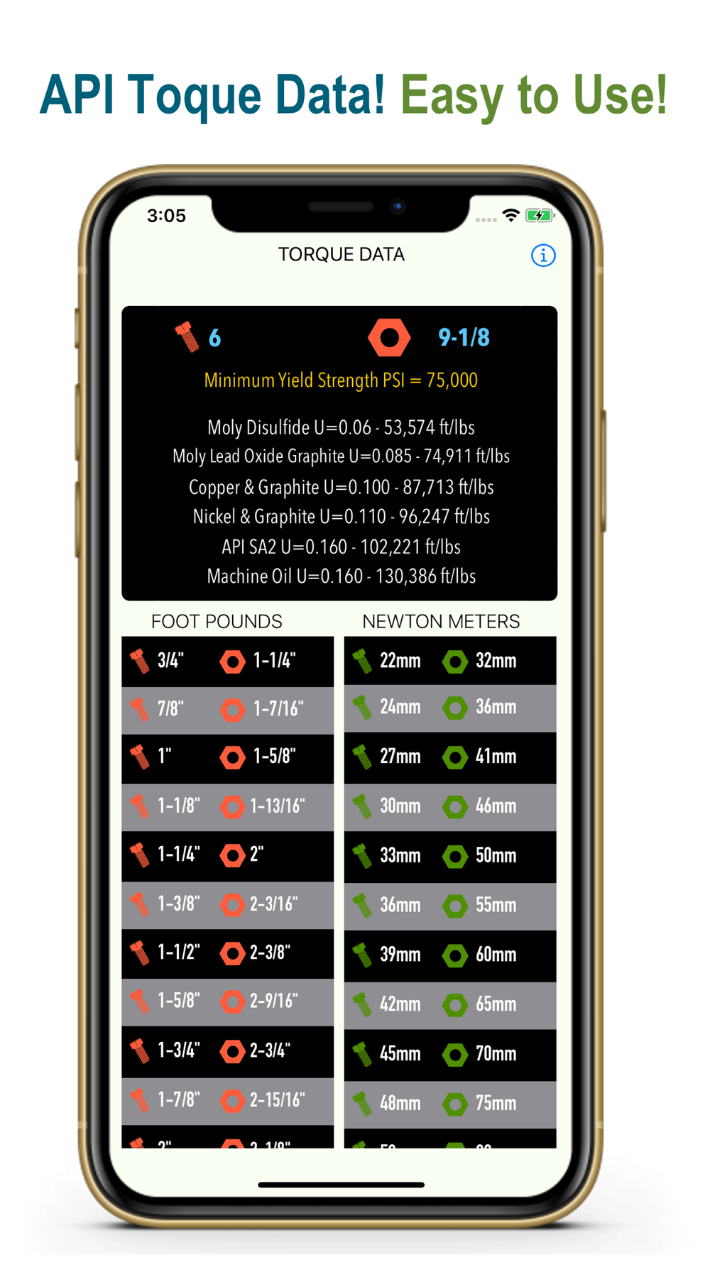 Torque Data is a easy and simple app. Very useful and handy app.Simply select the bolt size and nut size and view torque data for specified lubricants. You can also convert it to Newton Meters.