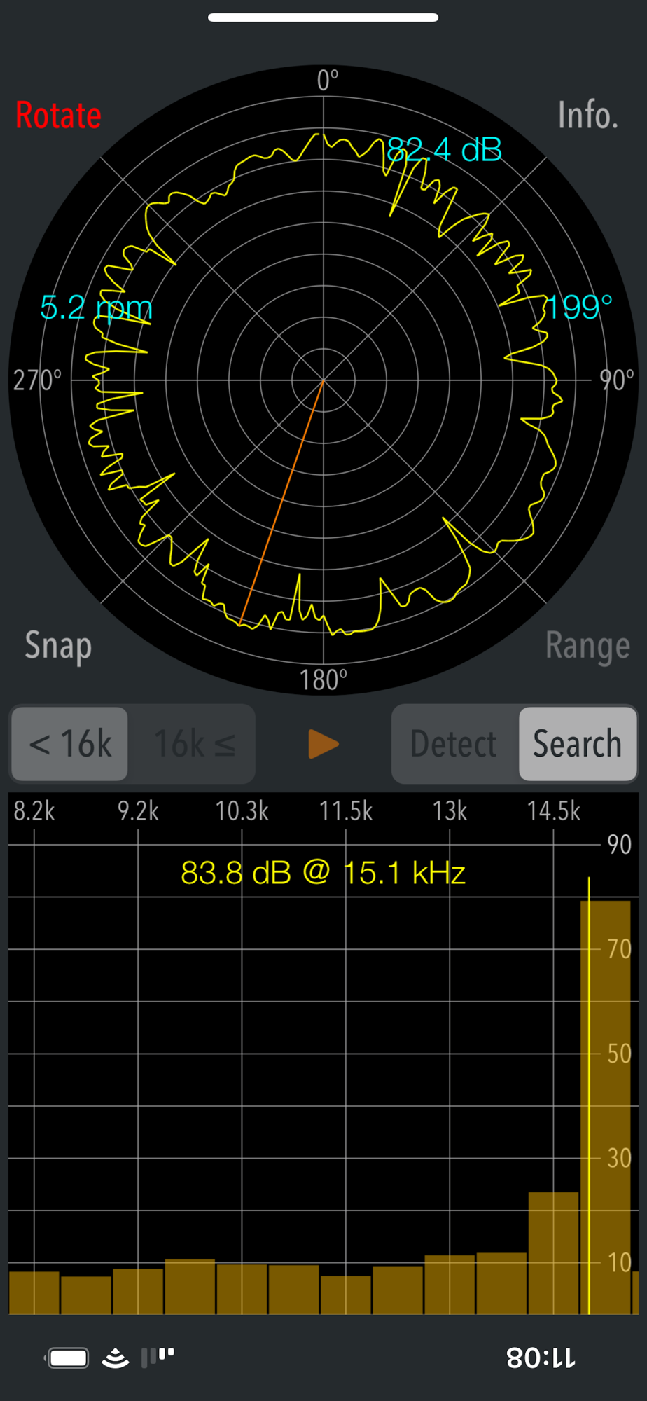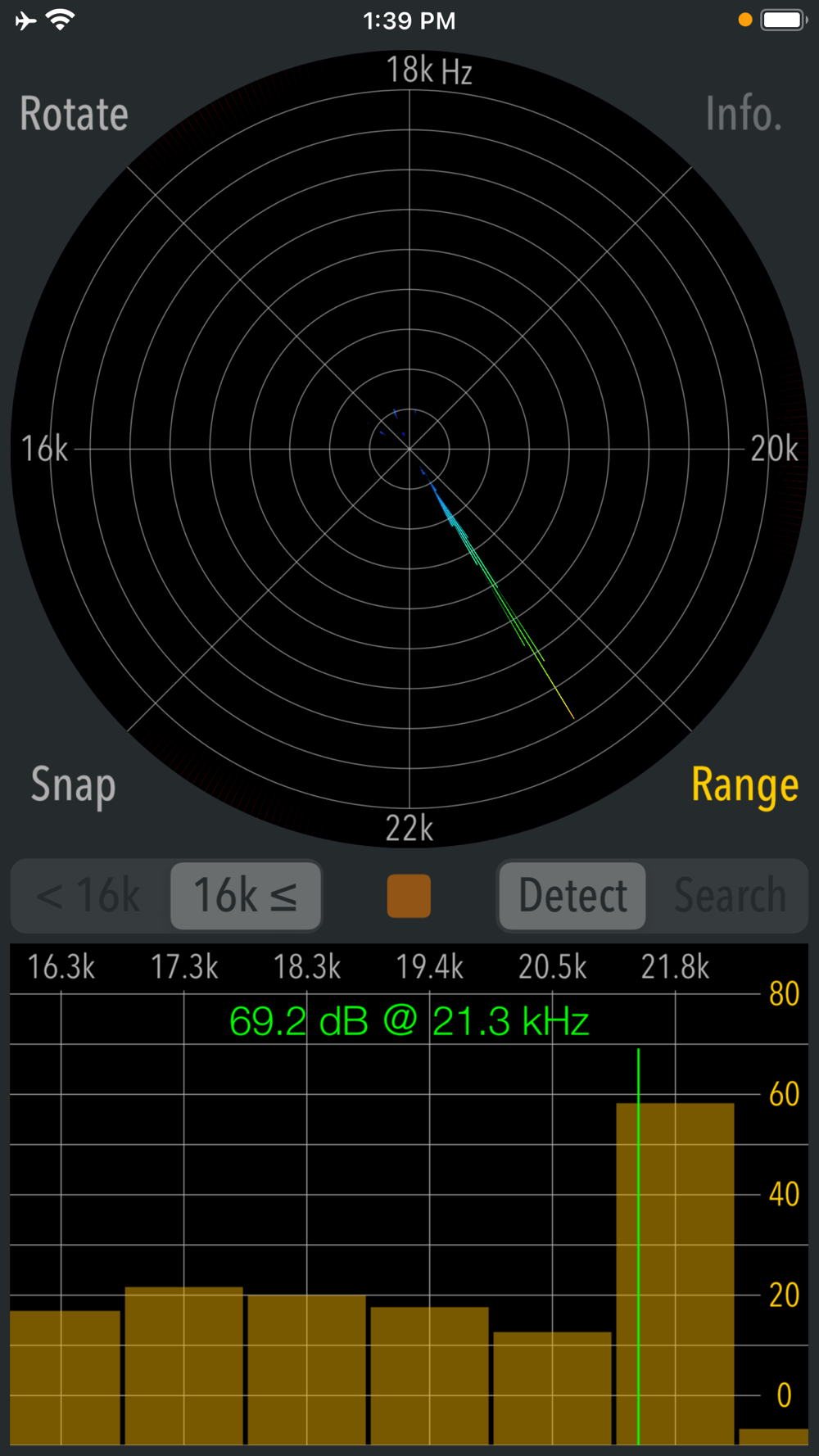 This app has two operation modes, "Detection" and "Search". Detection mode can check if there are high frequency and ultrasonic sounds that you can not hear. Search mode can find the direction of high-frequency sound source. It can only be used when it has found the peak frequency in Detection mode.