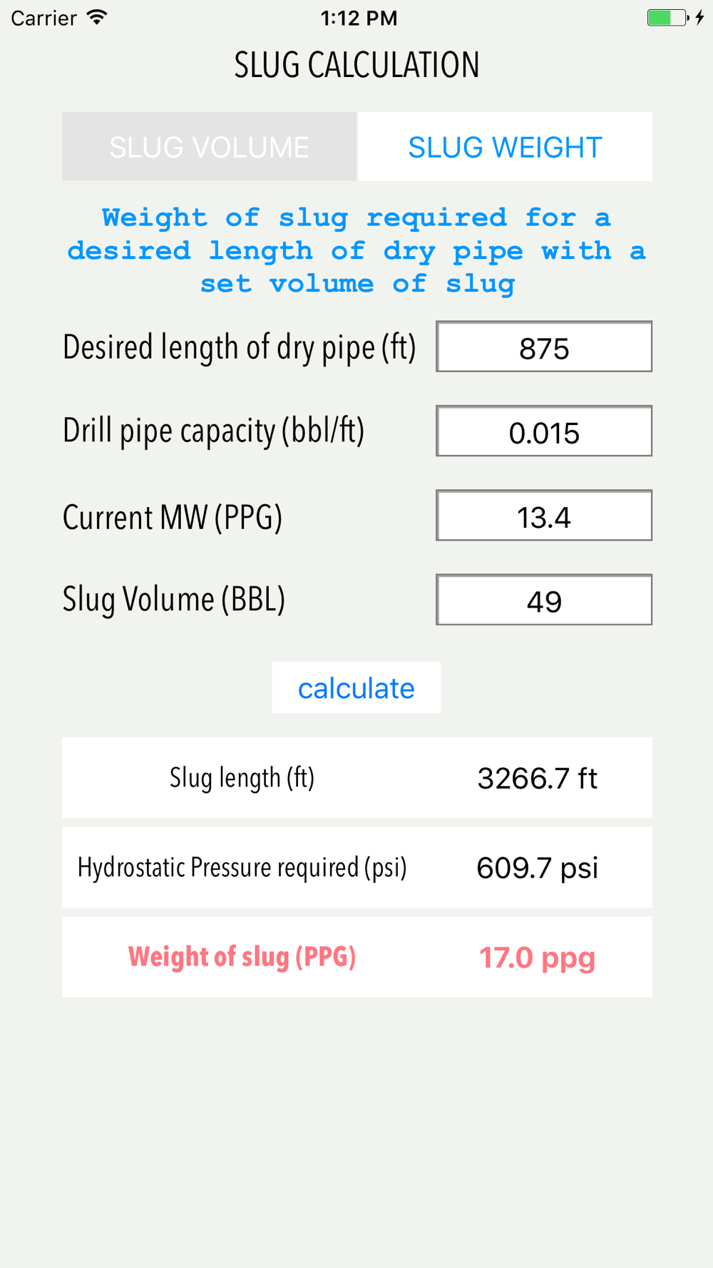 _ Slug Weight Calculation: Weight of slug required for a desired length of dry pipe with a set volume of slug