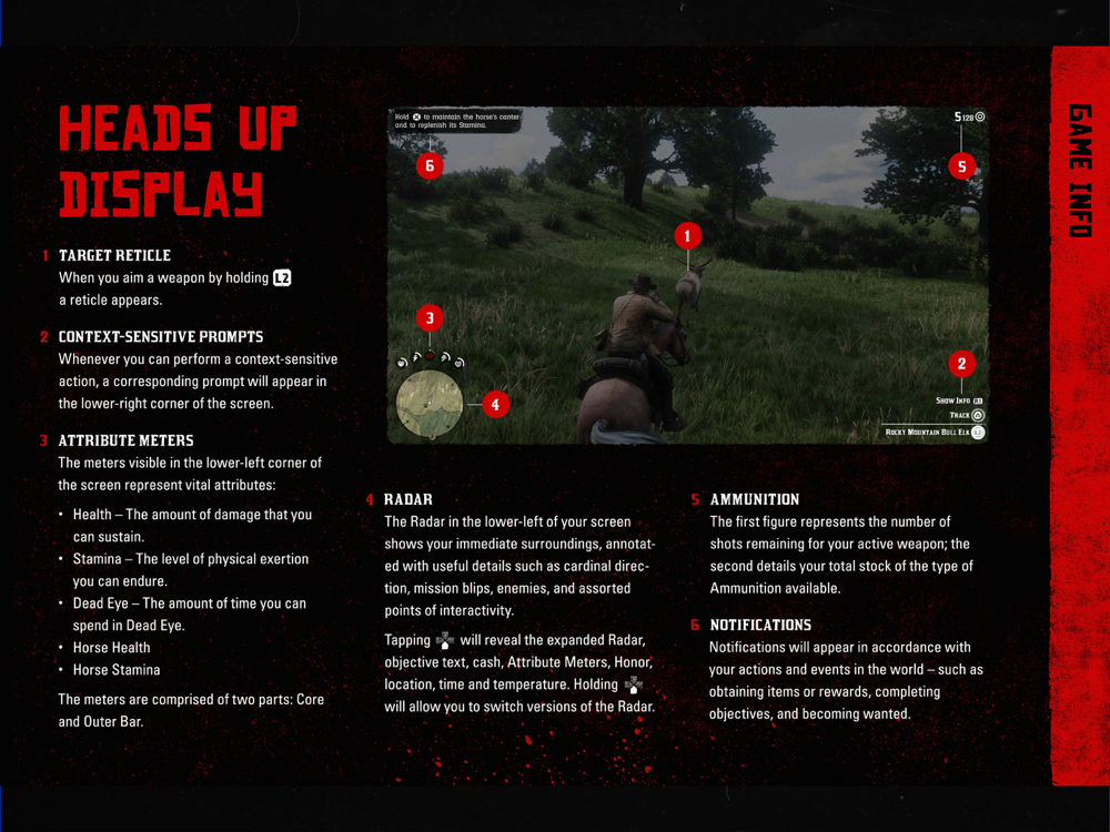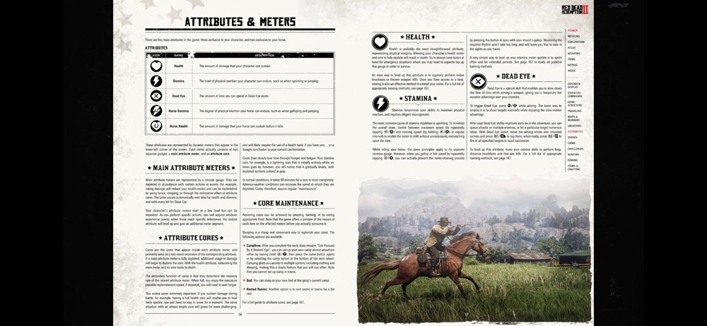 The official manual for Red Dead Redemption 2 detailing general game controls and everything from player attributes to combat, fishing, hunting, horse bonding, activities and more.