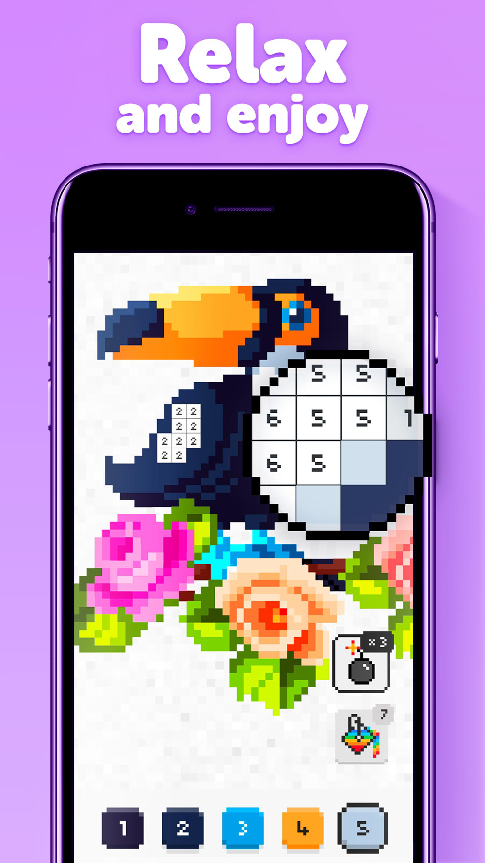 Just shelter from the stress of life and complete a variety of unique anti-stress pictures. It’s so fun and so easy to color you don’t have to be good at art! Just follow the numbers in pixel boxes. A special color palette at the bottom will suggest what number is what color.