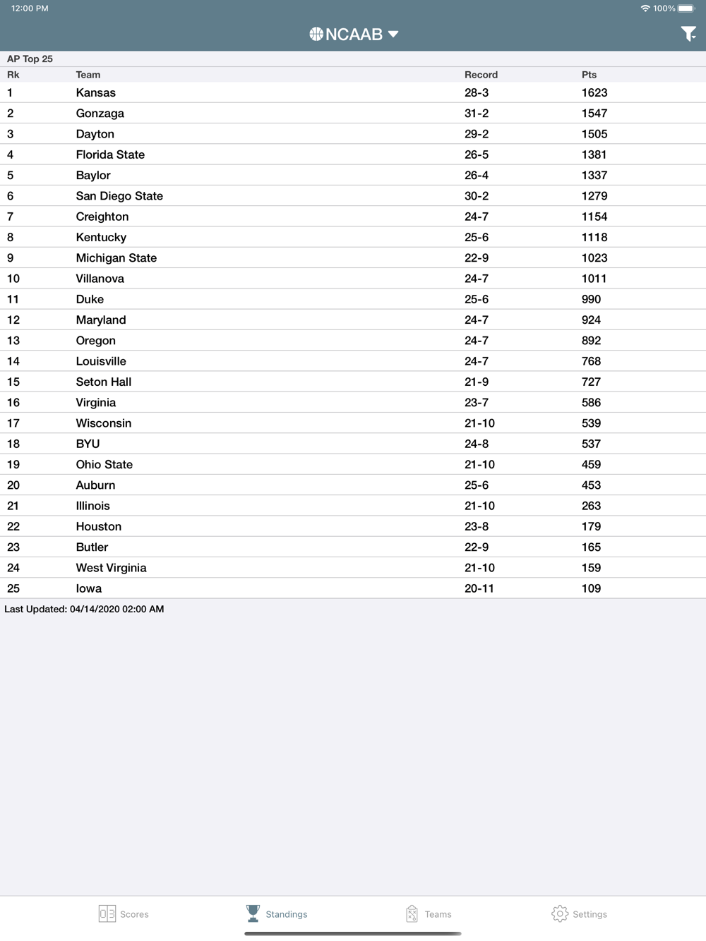 Setup your favorite teams, and view them all on the same page for easy browsing. We made it easy to check out college basketball stats and analyze your favorite teams scores throughout the season!