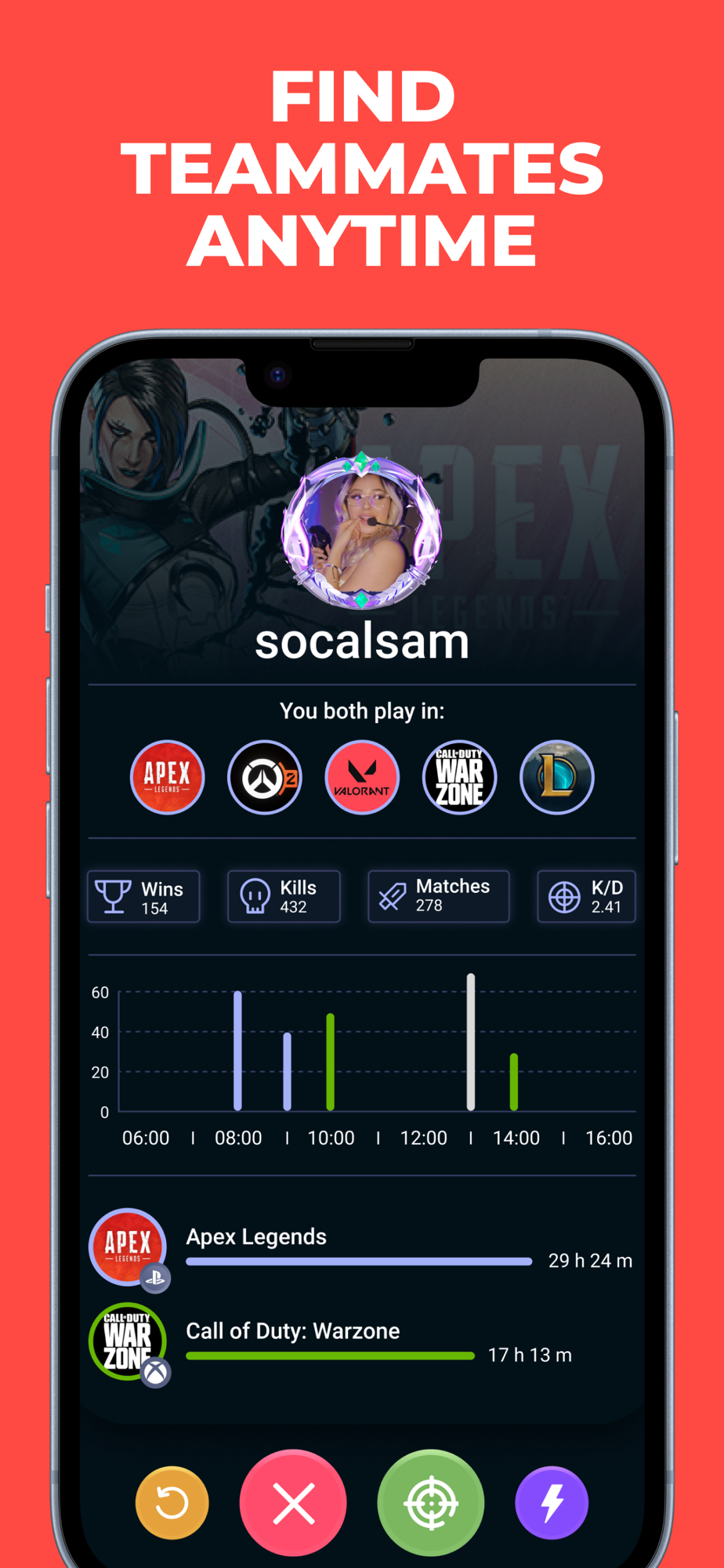 Use Swipes to like or pass on players. If someone likes you back, it’s a Match! No stress. No rejection. No playing alone. Just go through profiles, chat or call, play together, and see how your stats improve.