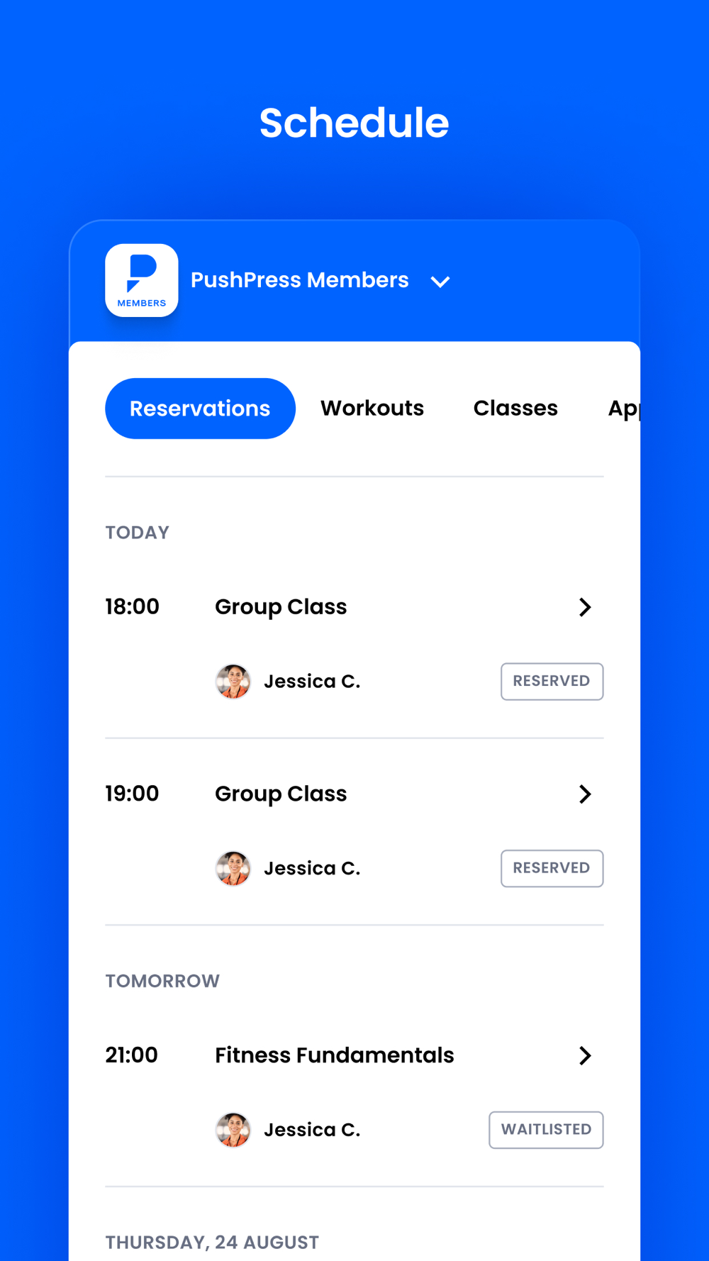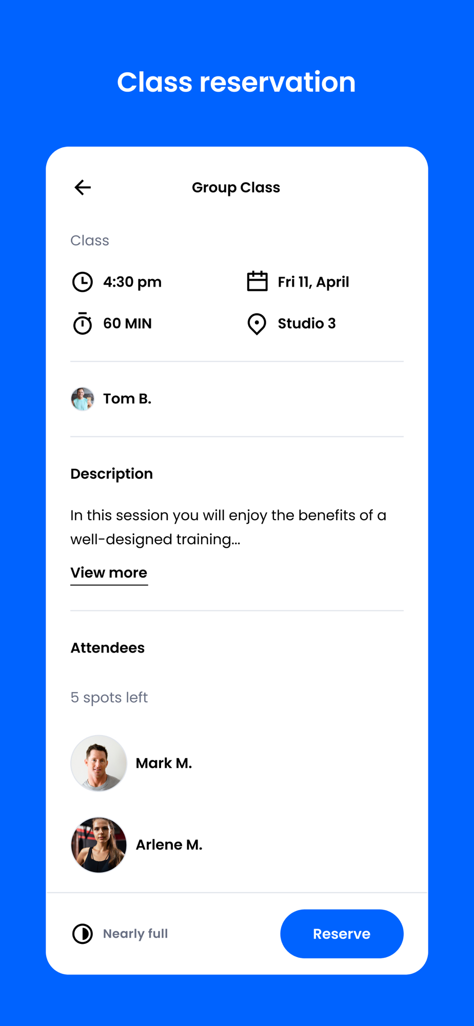 For gym members to reserve their place in a class, sign up for gym events, purchase product pre-orders and general account management like updating headshots and credit card on file.