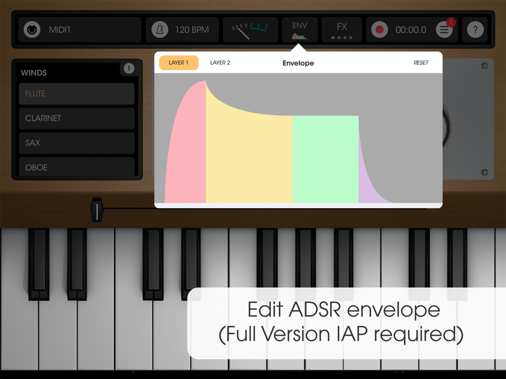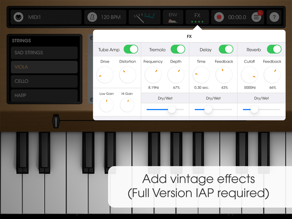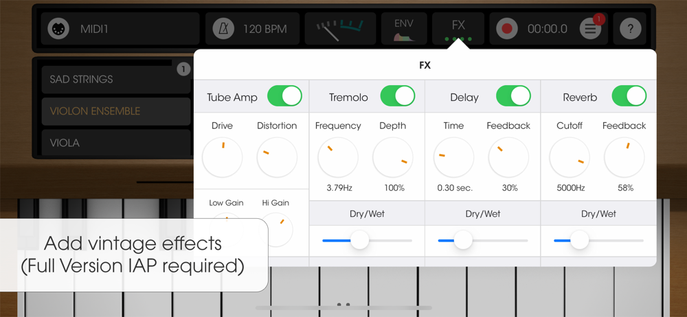 Get the « Full Version » IAP to get all the 18 instruments, including : Electric guitar, Vibraphone, Sad Strings, Piano, Choirs, and more (FX & Live Recording).