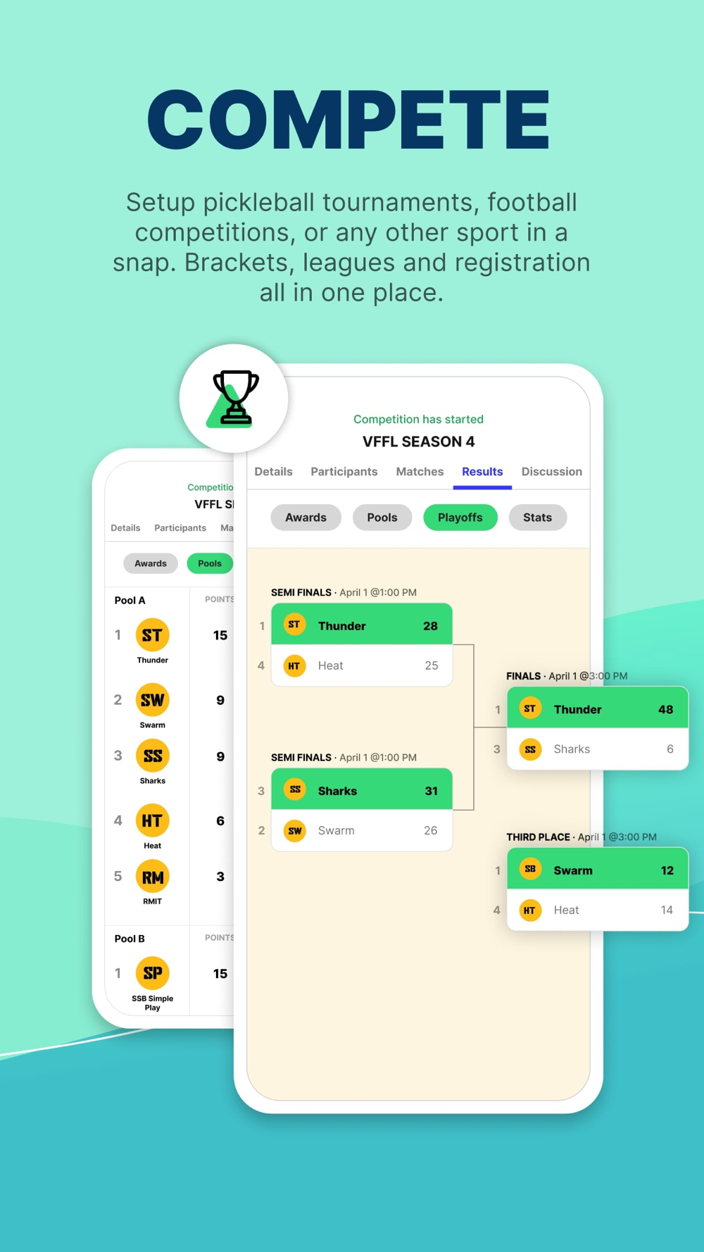 COMPETE. Setup pickleball tournaments. football competitions, or any other sport in a snap. Brackets, leagues and registration all in one place.