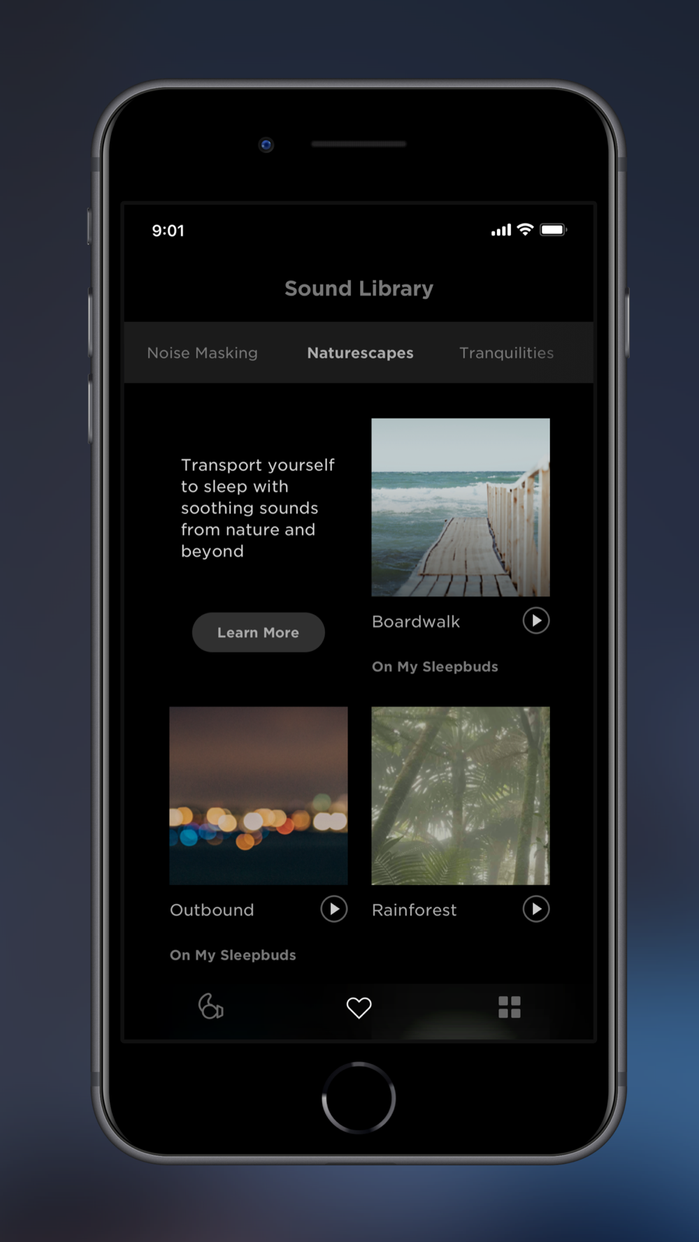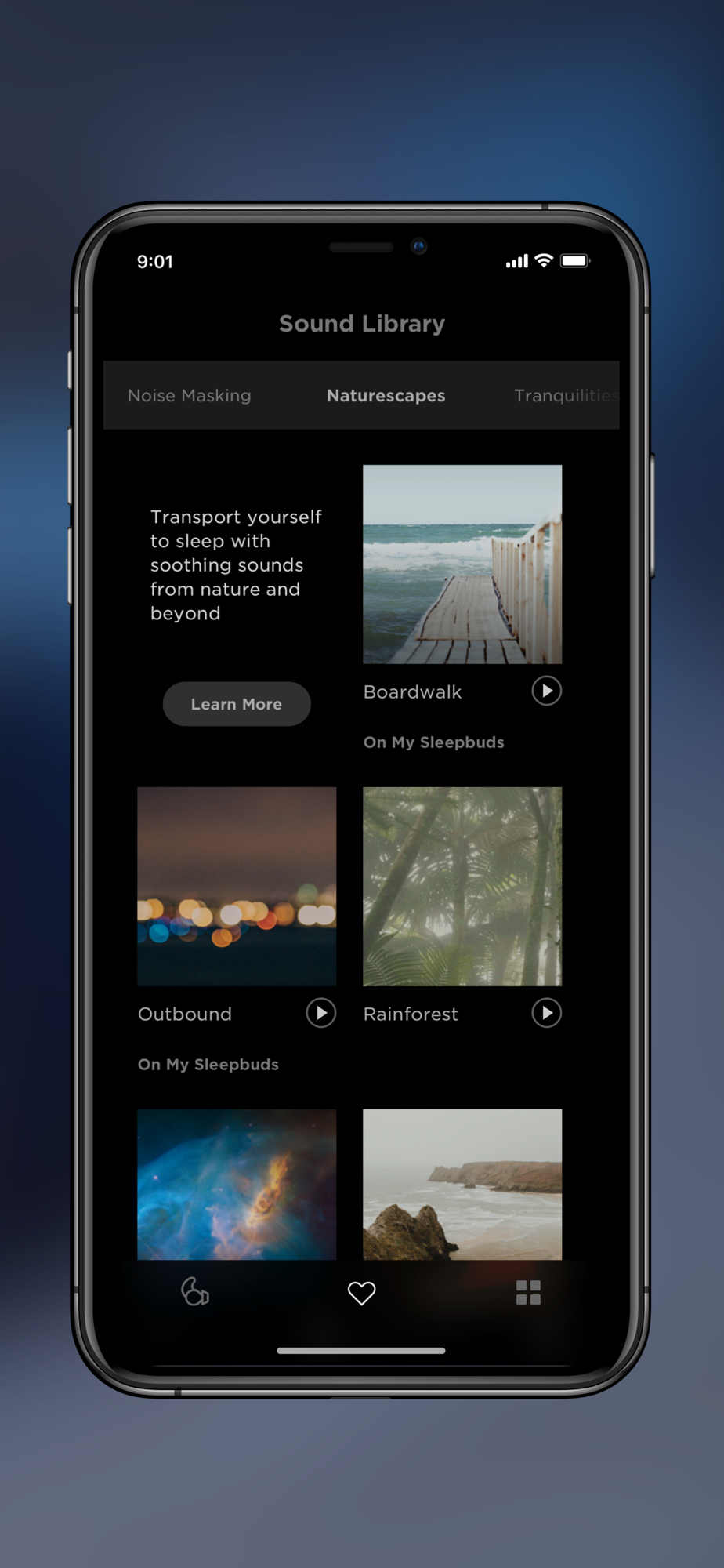 Full control of Sleepbuds™ is at your fingertips. Explore the Sound Library and download your favorite noise-masking sounds and relaxation content to build your nighttime routine. Customize your experience by adjusting volume, setting a personal alarm, accessing features like Phone-free Mode, managing product updates, and more.