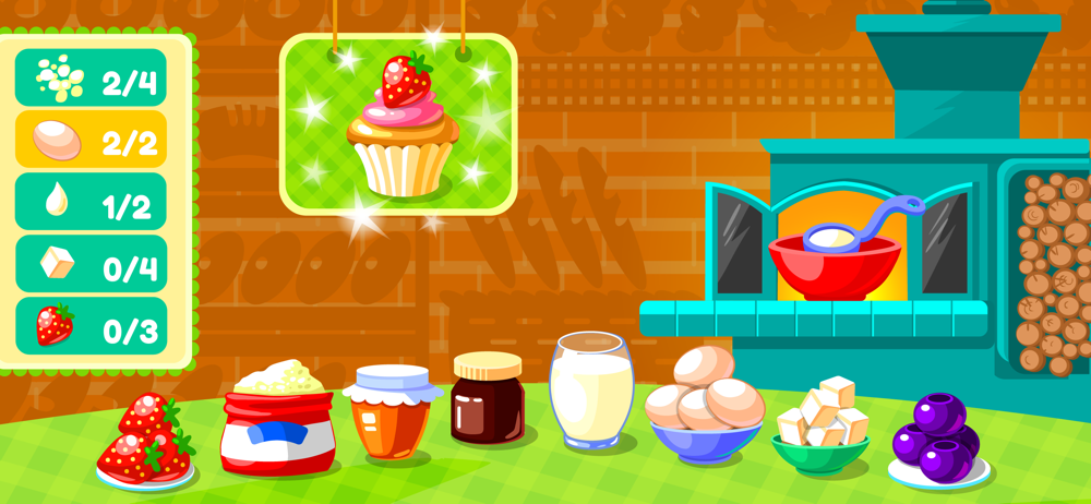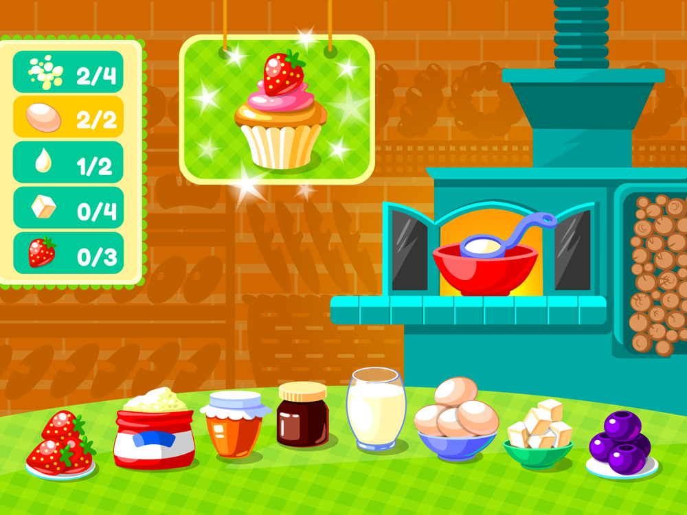 • Bakery: Put ingredients into the bowl and bake some fresh bread, a chocolate croissant, a waffle with apricot jam, a strawberry cupcake and a blueberry donut in the furnace. Let’s start cooking!