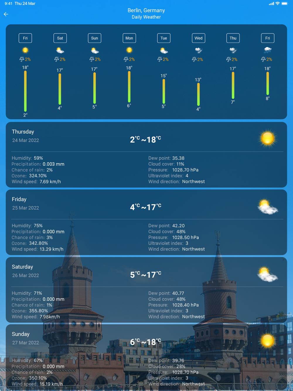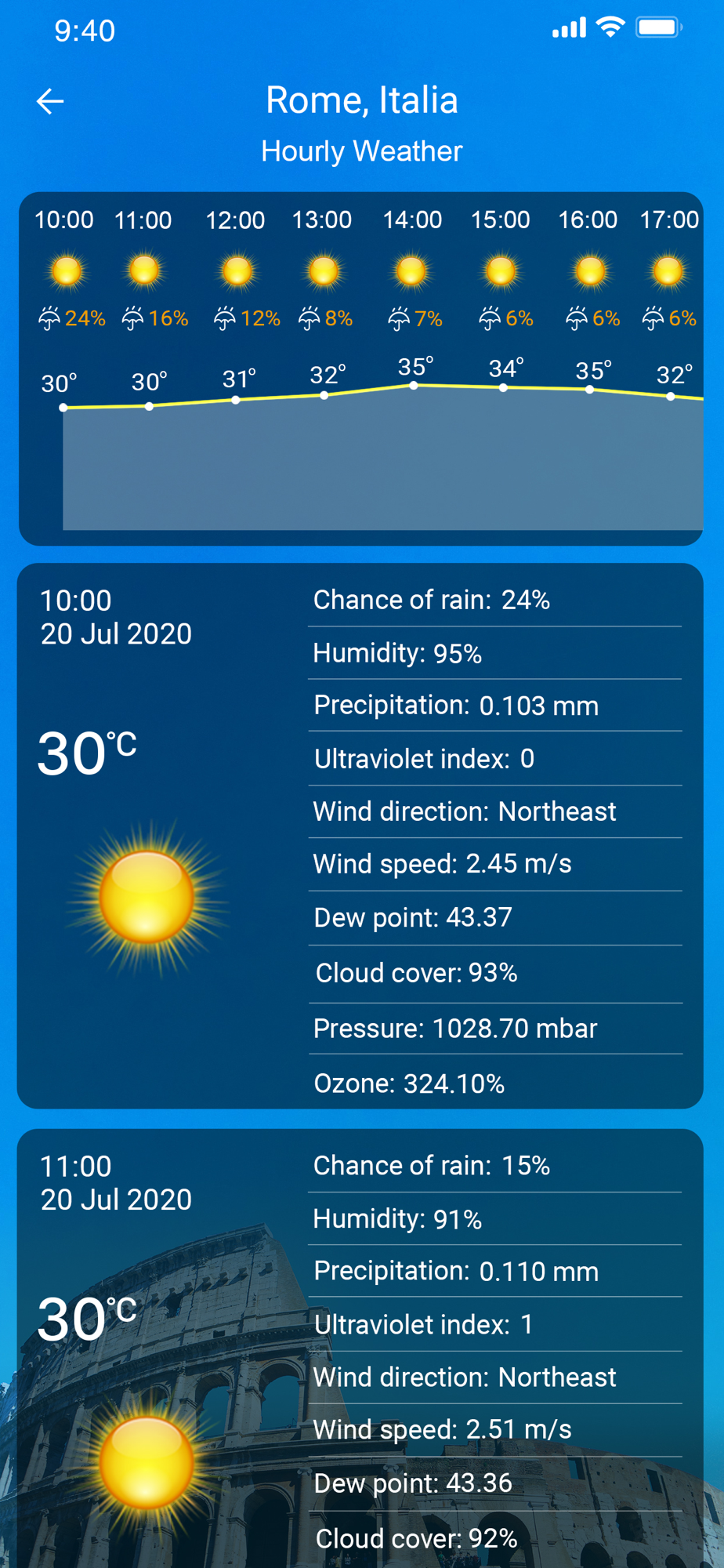 - Weather description: Sunrise Time, Sunset Time, Humidity, Precipitation Probability, Visibility, Wind Speed...