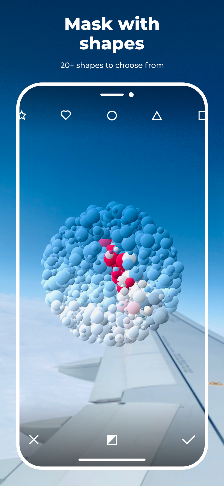 All effects can be masked with shapes to add a new dimension to your creations. Choose from stars, diamonds, hearts, and way more. All shapes can be inverted and transformed in any way.