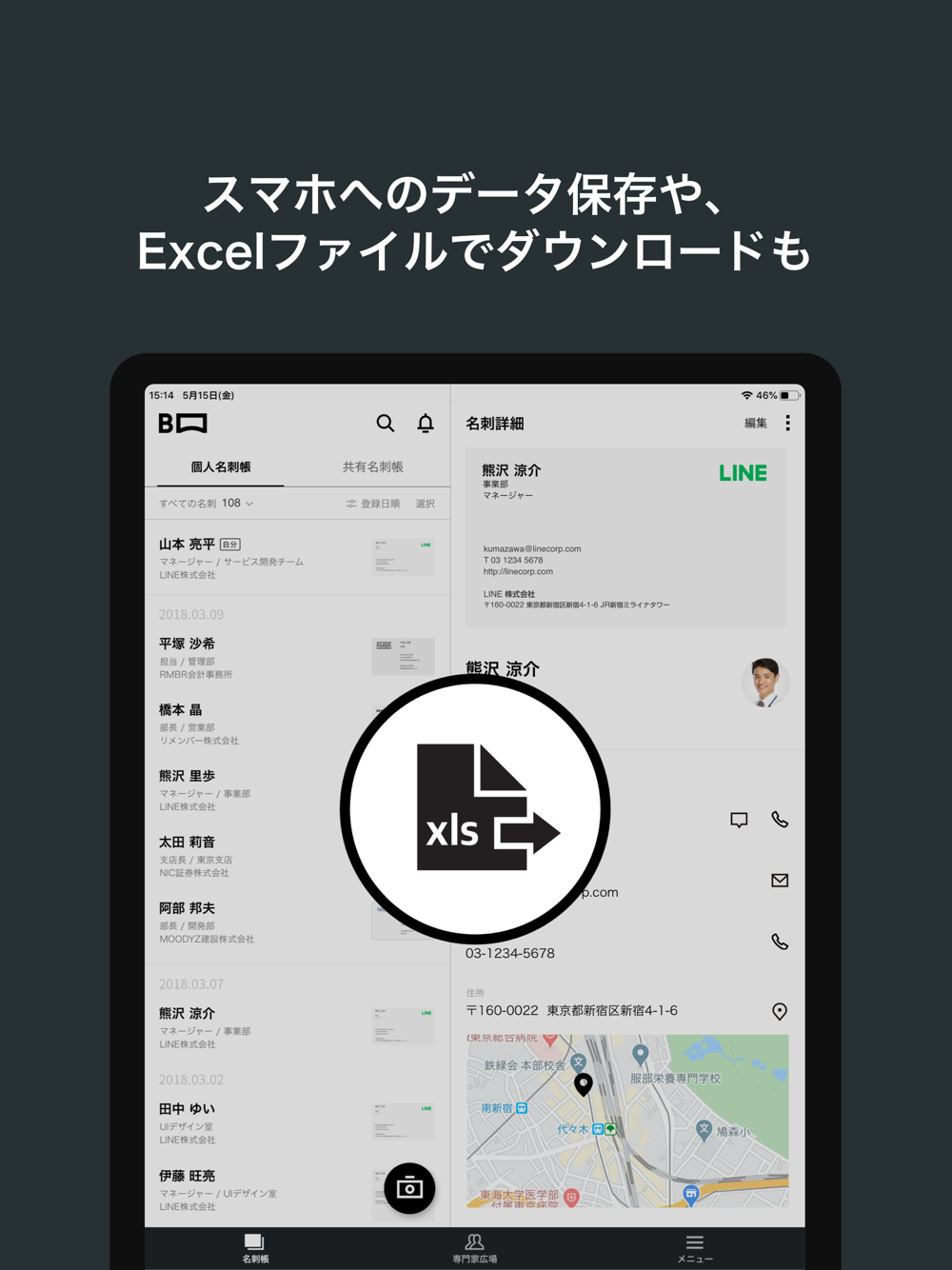 登録した名刺情報をスマホやGoogleの連絡帳に保存したり、Excelファイルで一括ダウンロードしたりできます。