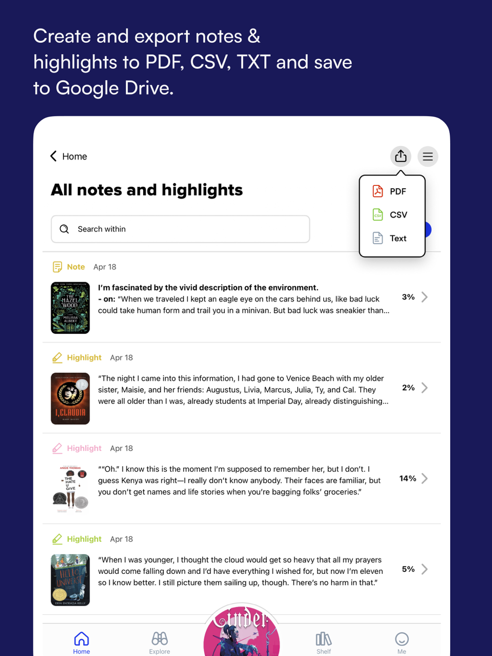 • Create and export notes and highlights