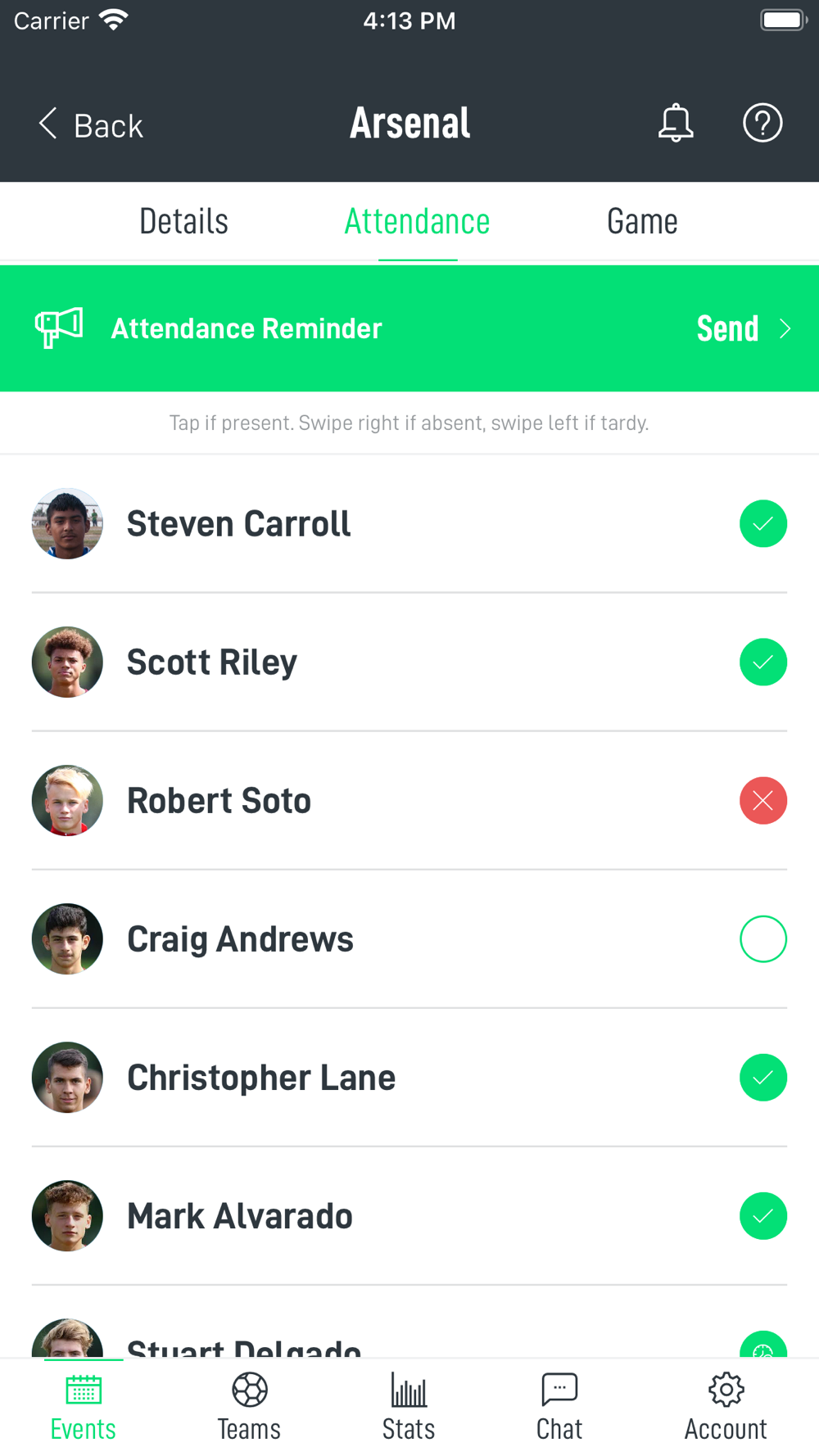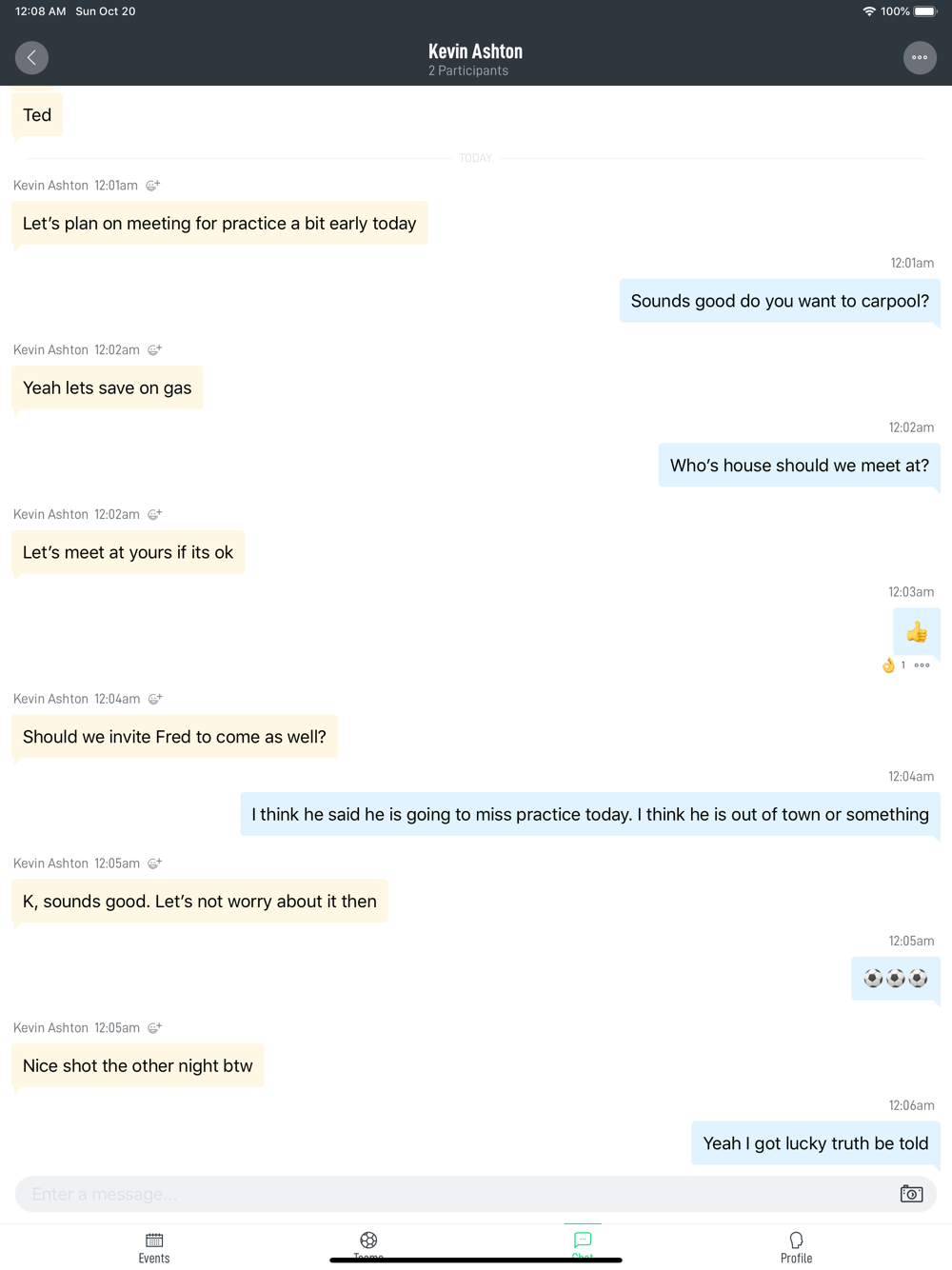 * Keep players, parents, and coaches in the loop with group chats all within the app. Our chat allows teams, parents, and players to communicate in a team chat channel and also has a directory so you can easily lookup and send custom messages to any individual or group within your club.