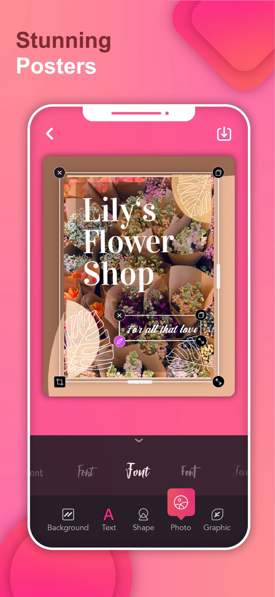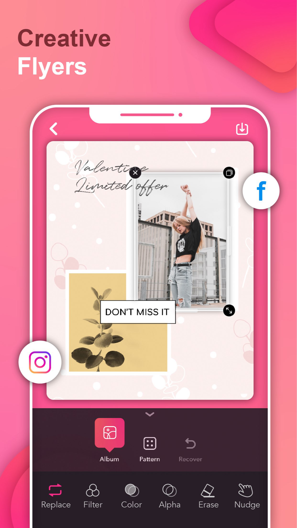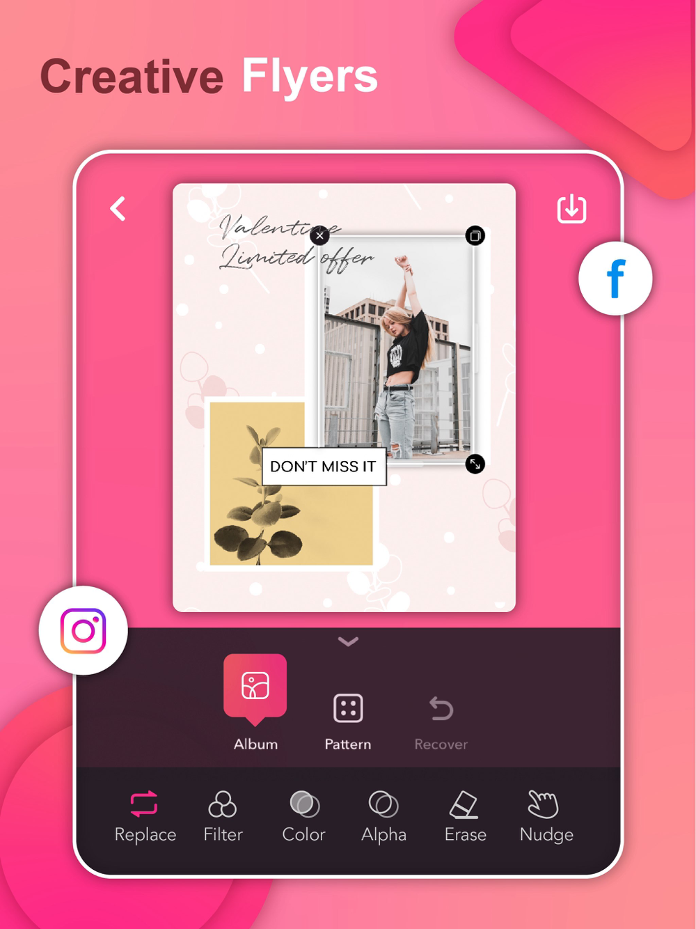 You can showcase your brand with thousands of professional designs in one tap, besides, there are amount of eye-popping templates for Instagram story, Facebook post, Banner, Logo for you to express your personalities. All your designs can be customized, you can change the colors and captions, photos, graphics and fonts every time.
