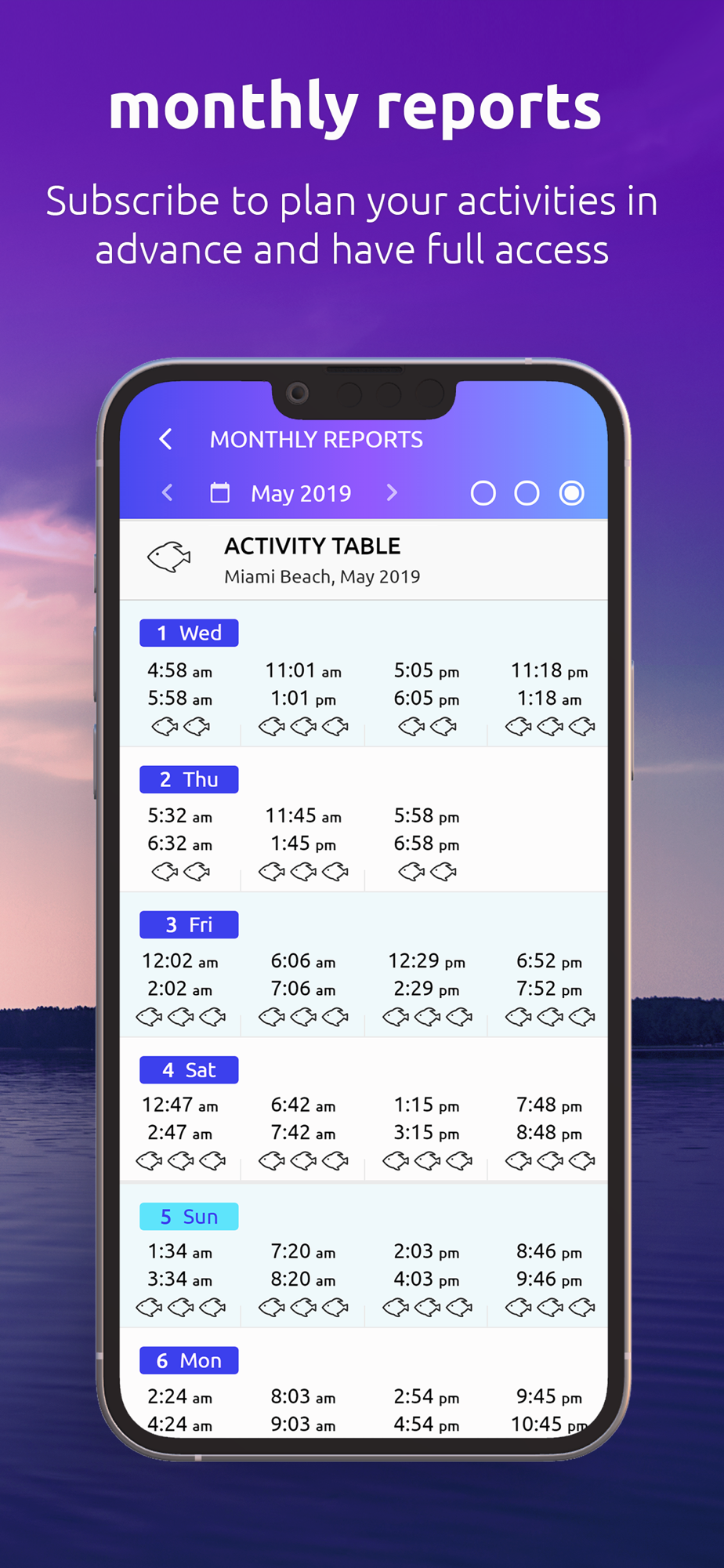 Hourly activity chart and solunar periods with the best fishing moments of every day. Monthly activity table with daily fish activity and major and minor fishing periods.