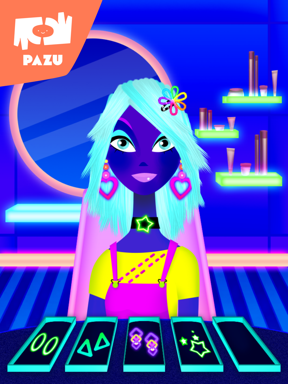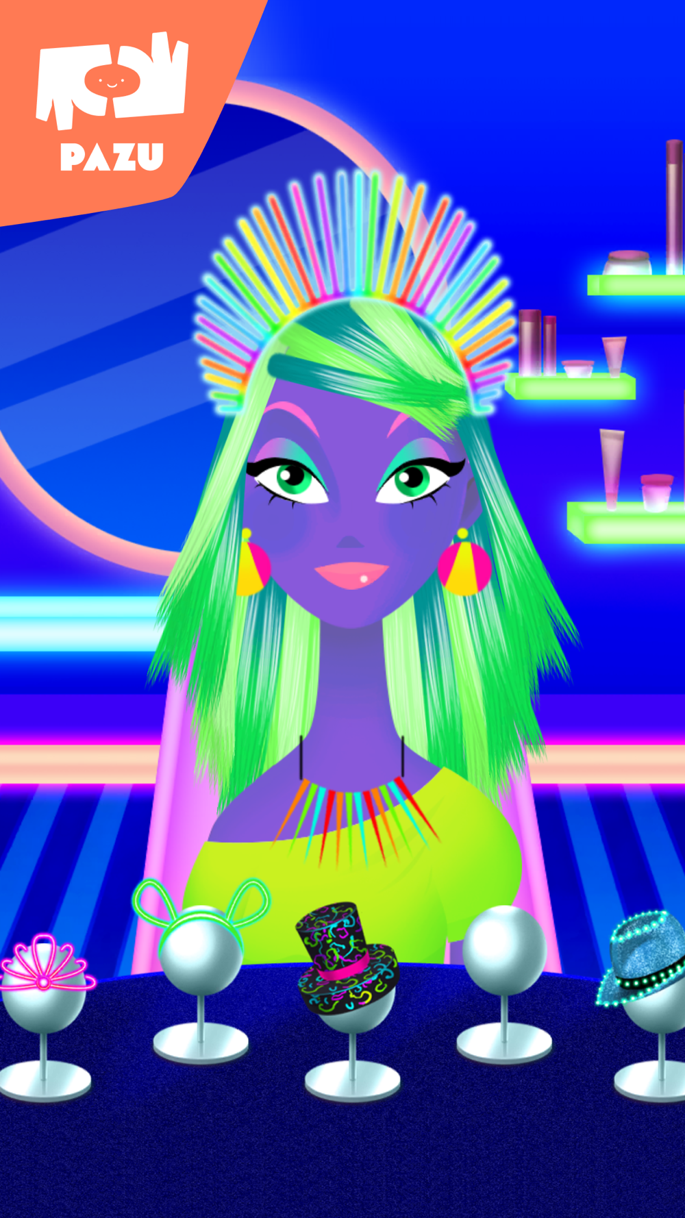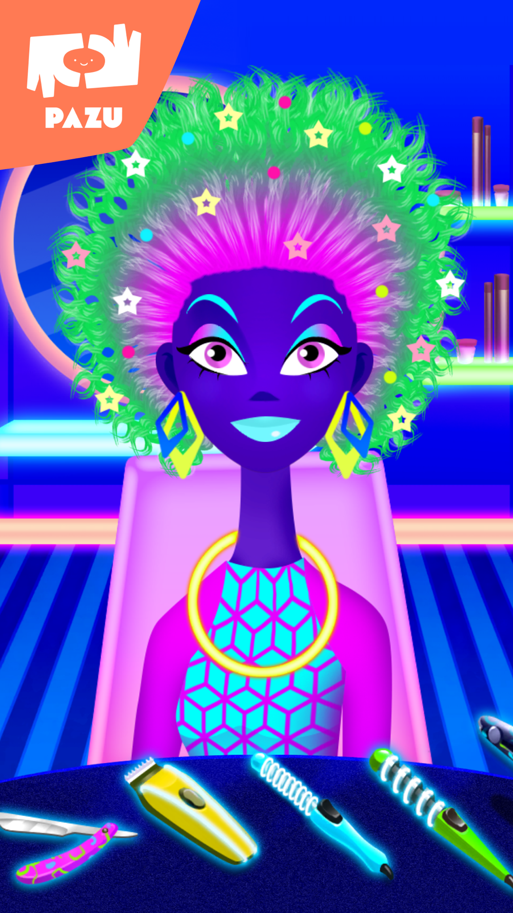 Girls Hair Salon is a fun and interactive game from developers PAZU Games. Now you can own your own hair salon where you can color, cut, and dress your very own animated characters! Become the fashion glow stylist you’ve always wanted to be and makeover your character as you wish. Girls Hair Salon is a hair game full of interactive features and innovative tools to help you become the neon costume stylist you’ve always dreamed of and turn your characters into glow star! Here’s how!