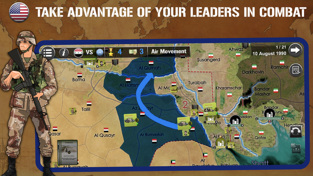 • Combat units may be from the land, naval or air domains. You will find different types, such as infantry, cavalry, artillery, guerrillas, submarines, flat tops, fighters, elephants, anti-aircraft batteries, etc ... All of which can be combined into different stacks for easy handling.