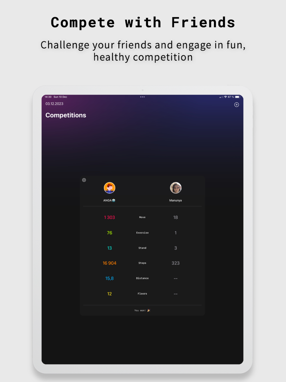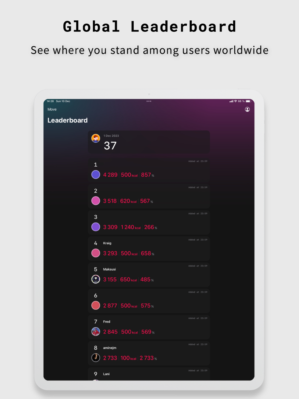 - Global Leaderboard: Participate in a worldwide leaderboard without needing to add contacts. Sort results by Move, Steps, Distance, or Exercise.