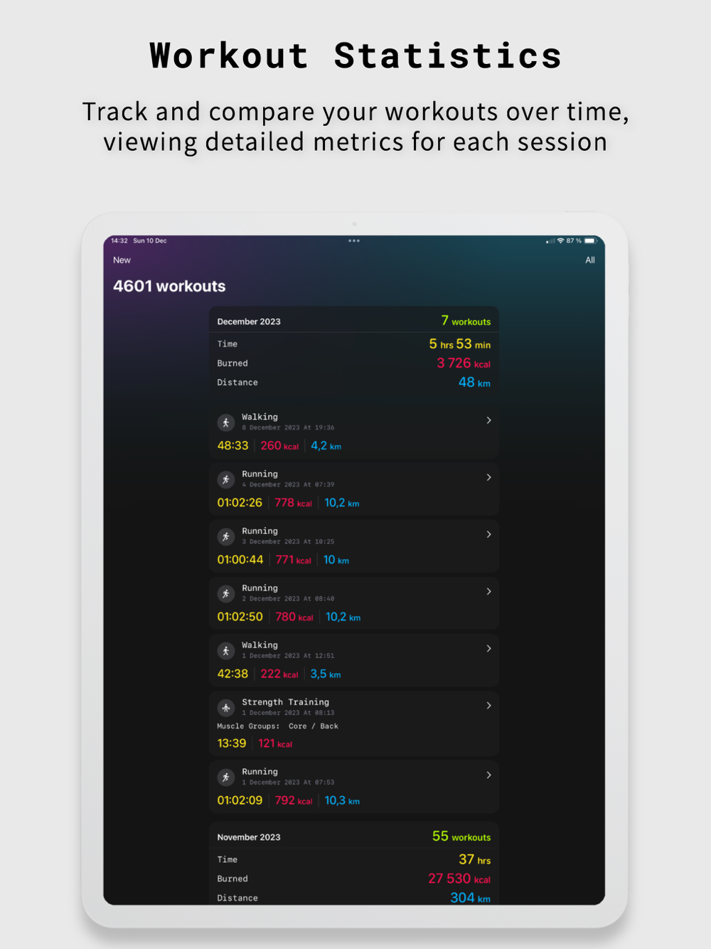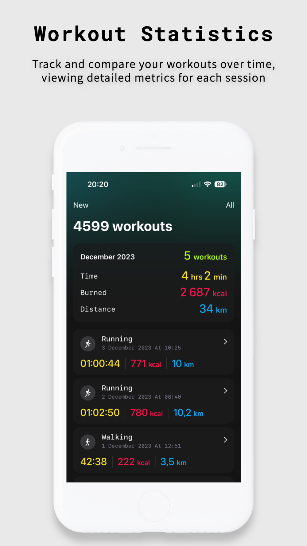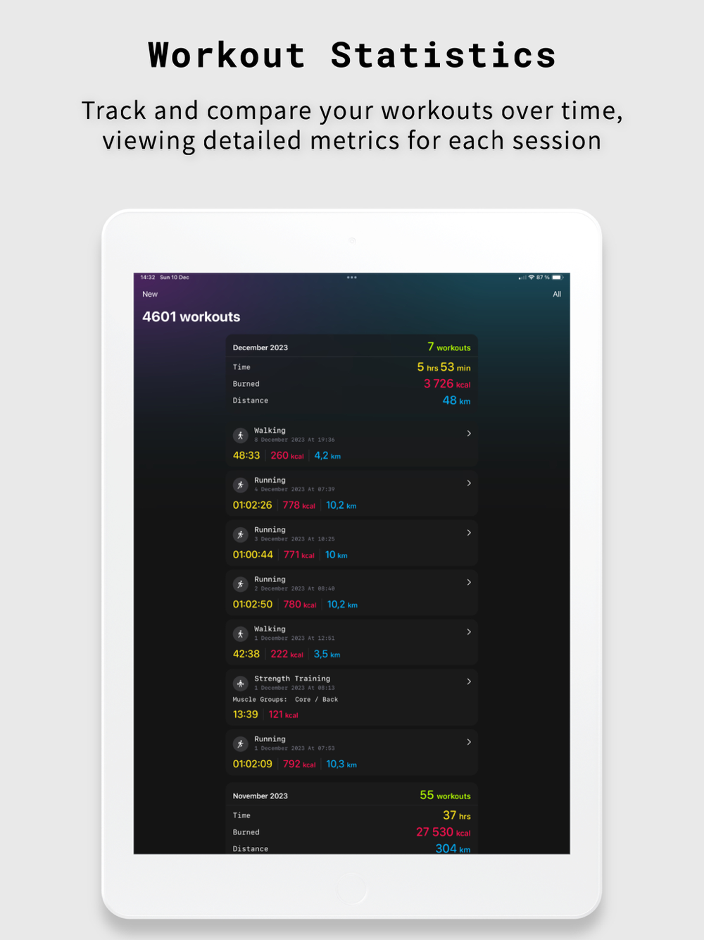 - Workout Analysis: Review your workout sessions and compare monthly results with various metrics.
