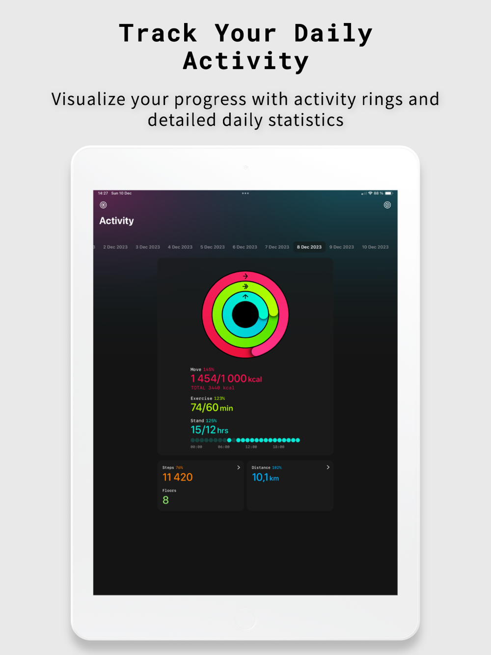 - Comprehensive Activity Tracking: Record your steps, walking and cycling distance, general activity, and flights climbed.
