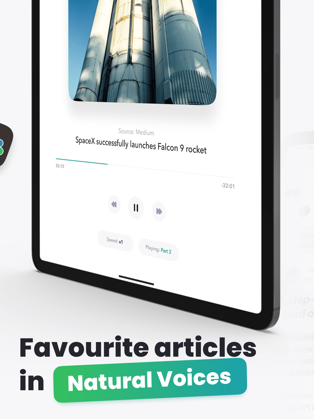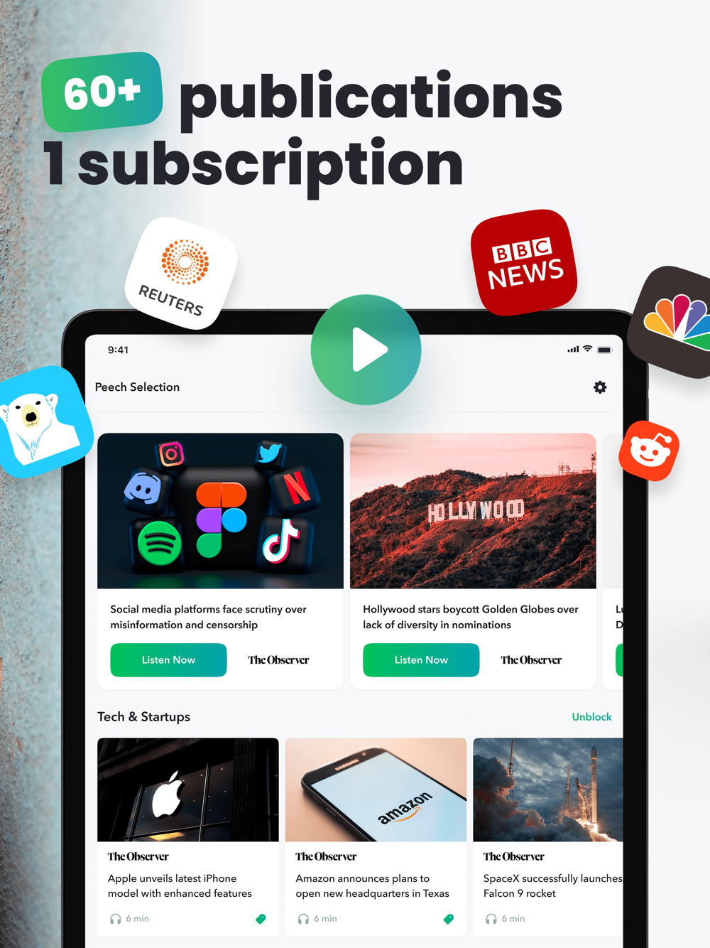 • Turns any article into sound: One app, All Publishers, In Audio!