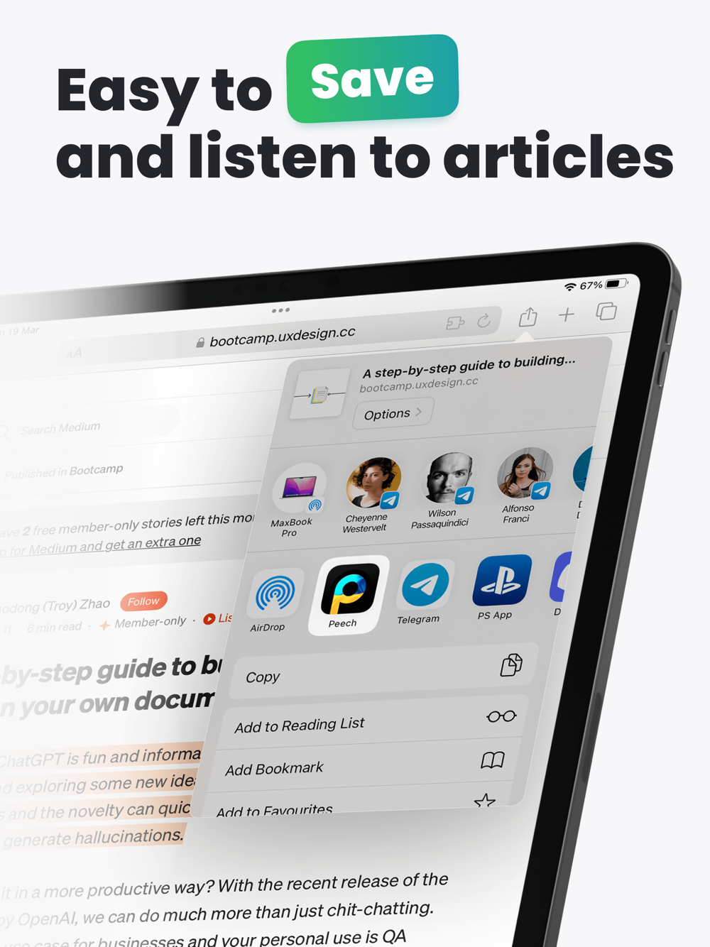 • Listen to articles, Twitter threads, PDFs, text, or physical books as audio.
