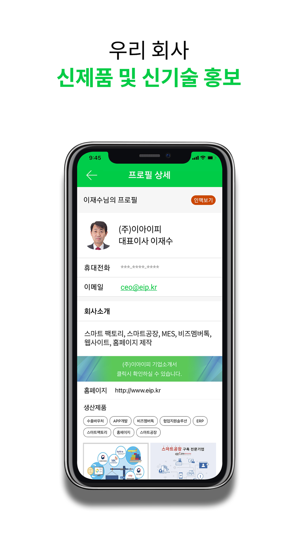 - 내 프로필 정보 및 회사,사업 정보 (회사 소개, 기업소개서, 제품사진등)를 쉽게 등록하고, 홍보할 수 있으며 내 인맥을 분석하여 인맥 확장을 위한 활동을 추천해드립니다.
