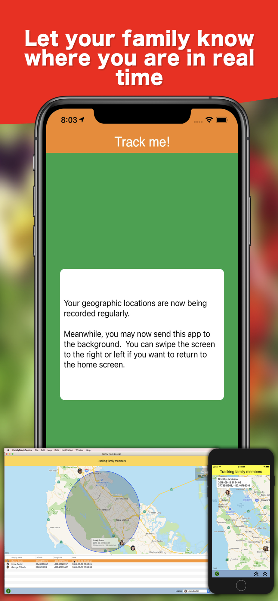 Family Track Me helps your family keep track of your geographic locations. They must use Family Track Central (for macOS and iOS) to see your current location on the map in real time.