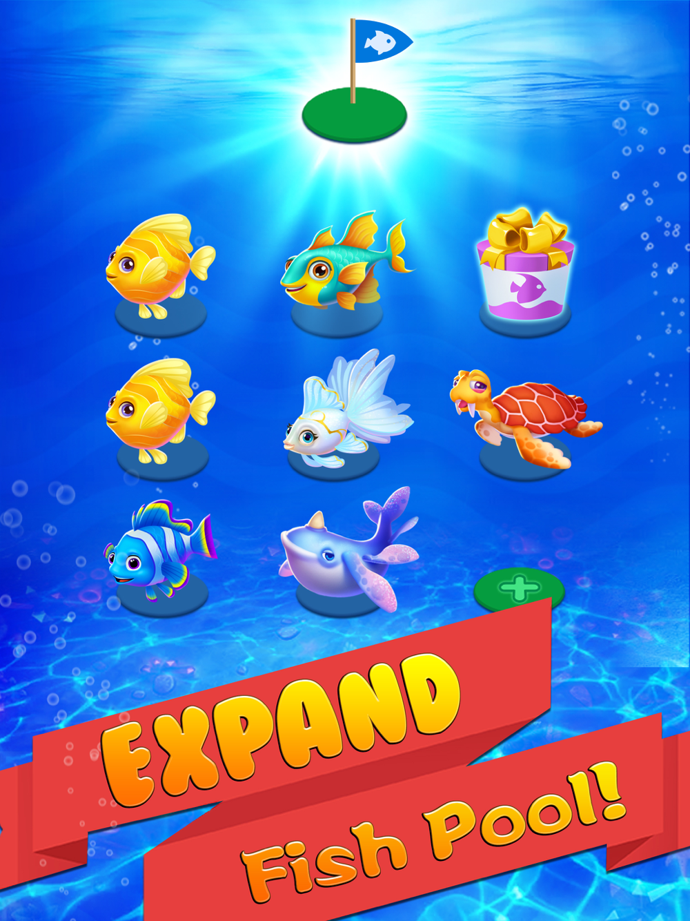 * Buy, Merge, and Manage your fishes to make them earn coins for you