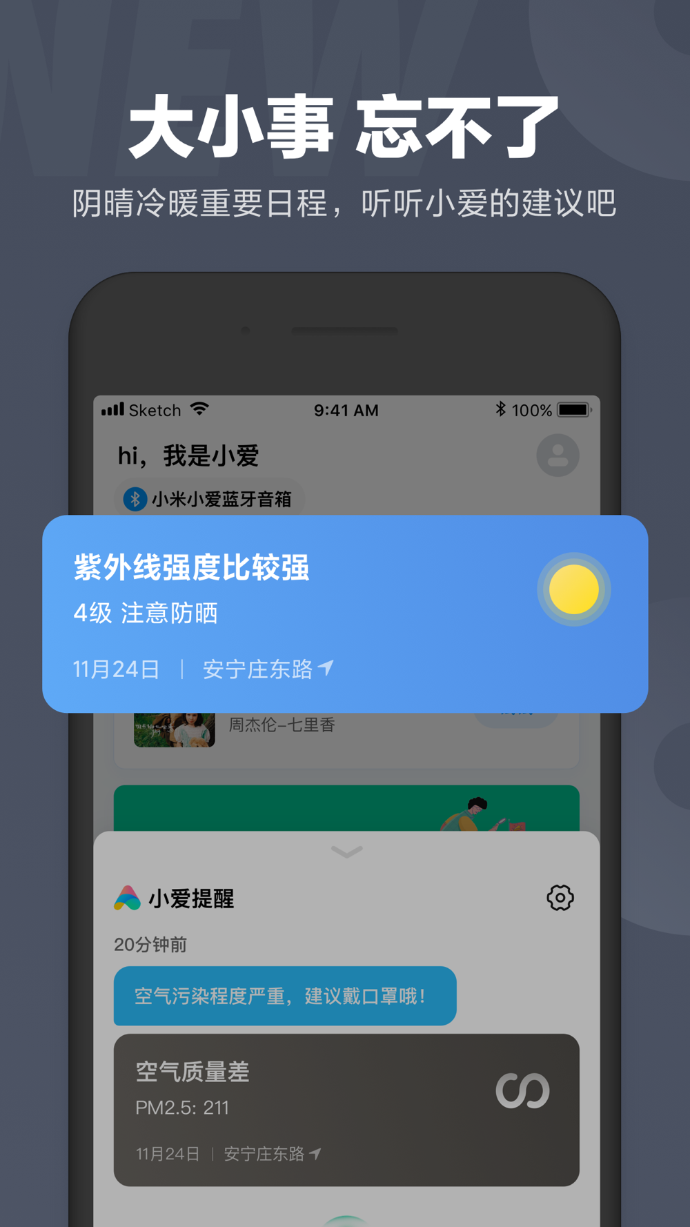 出门之前,记得让小爱告诉你外面的天气,做好准备;不知道地点?没关系,小爱会告诉你怎么去;路上无聊,可以看看小爱的百科、和小爱玩玩游戏打发时间;就算只身一人,别怕,小爱会一直陪伴你~