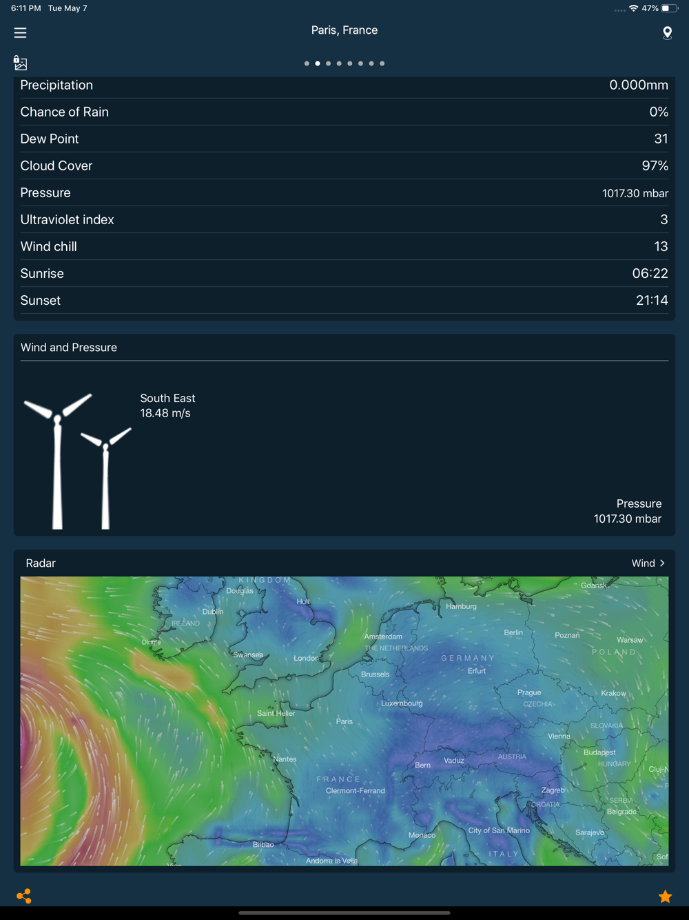 Real-time temperature, rain, snow, humidity, pressure, wind force and wind direction are all in this weather application based.