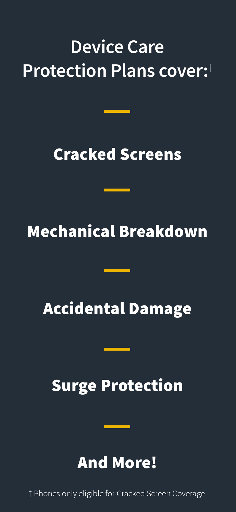 Damage coverage for your phone screens, laptops, tablets, TVs and more.