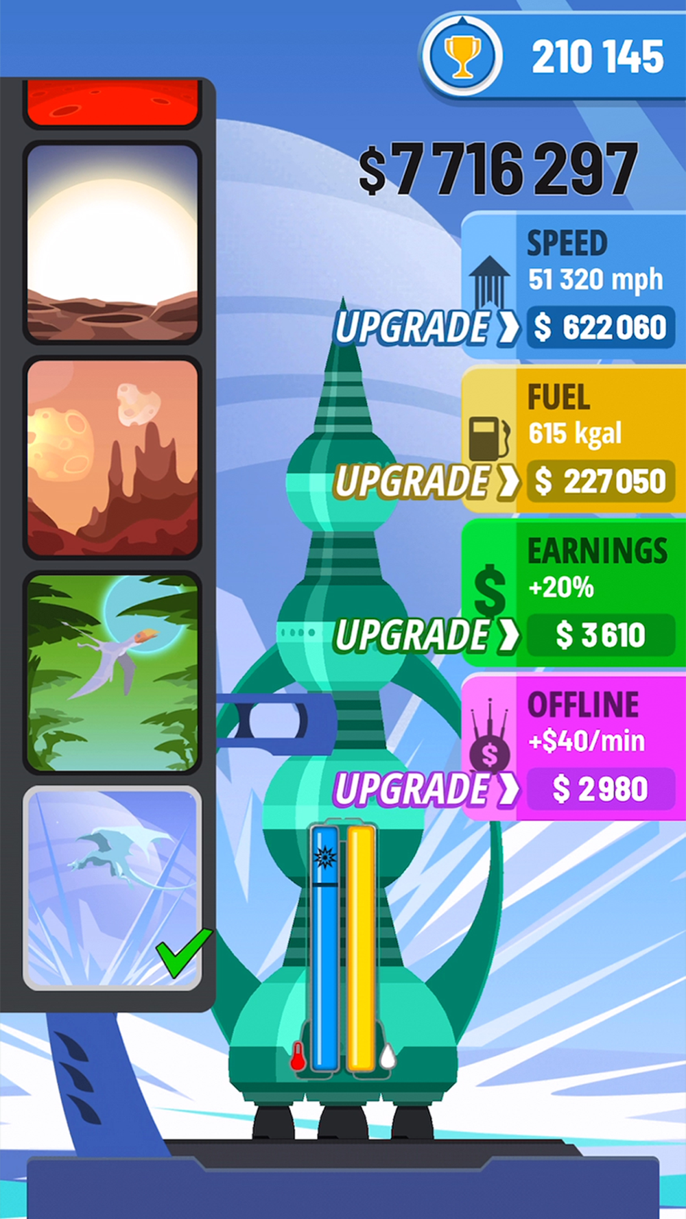 Upgrade your rocket to reach new heights, break records and explore new planets. Space is waiting for you!