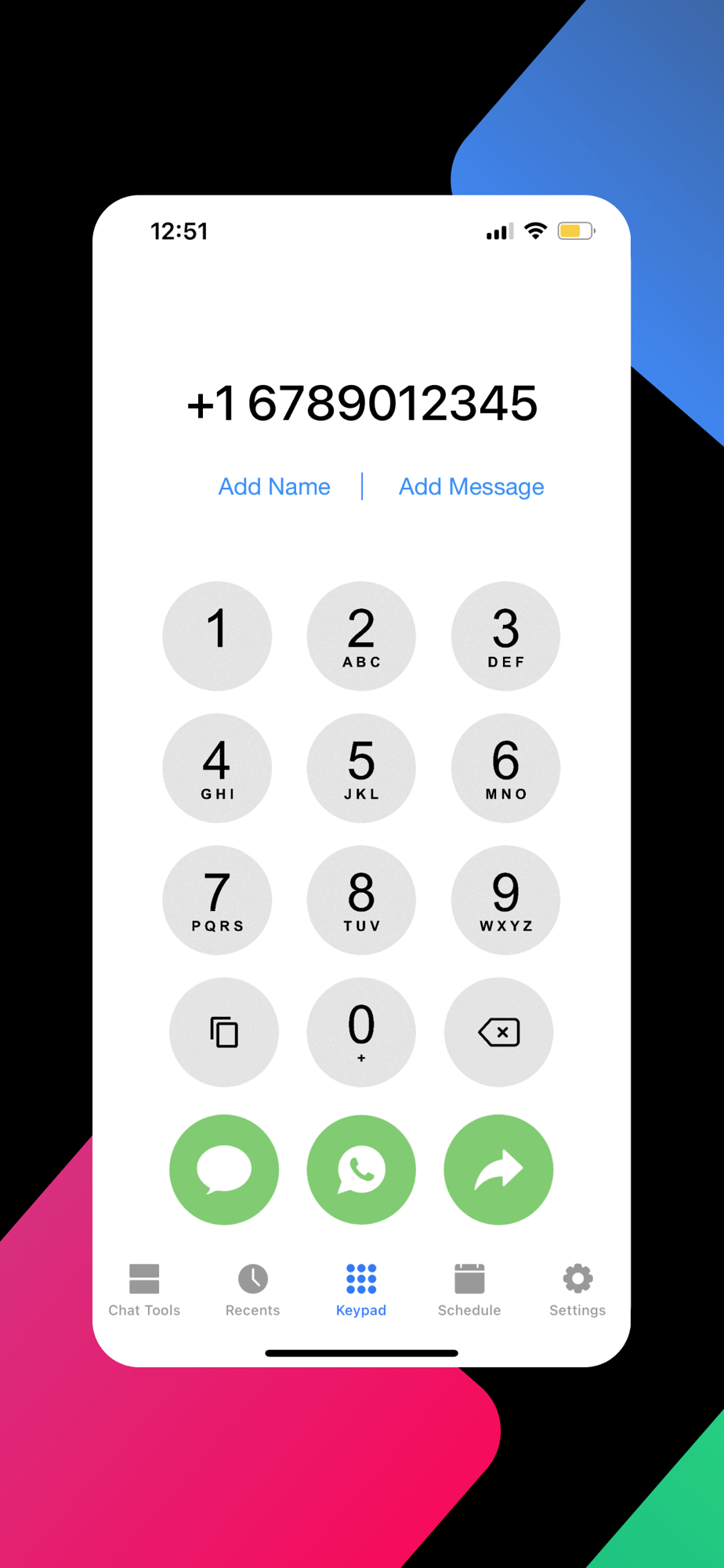Just type number, select message and click to start chat or call without saving the new contact or unknown number.