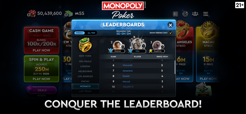 MONOPOLY Poker is a multiplayer game. Invite your friends to play with you in the tournaments...but will you be able to beat them?