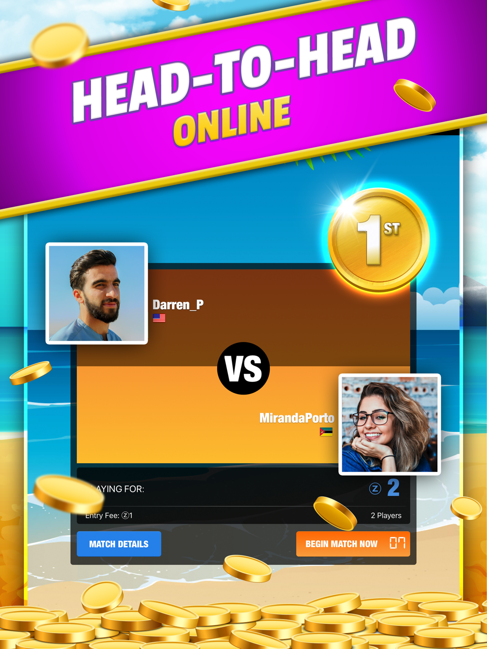 • Play Head to Head with other players or in large, multiplayer tournaments with actual rewards.