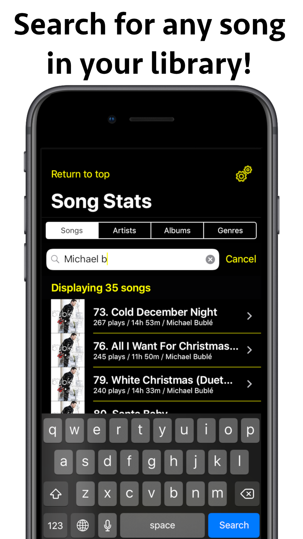 • Search for stats on any song, artist, album, or genre in your library.