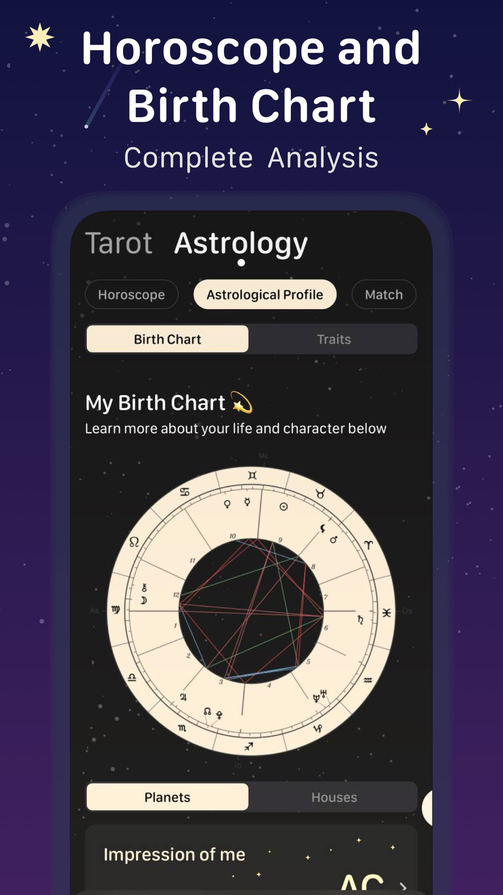 -Birth Chart: the location of the 12 planets during your birthday in houses and zodiac signs;